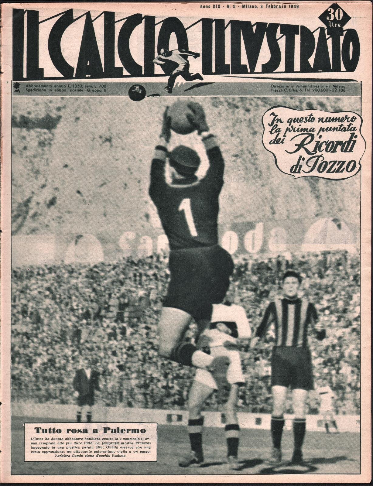 Condizioni mediocri. Blocco di 33 riviste de Il calcio illustrato annata 1949, in origine rilegati in un volume e poi staccati, pertanto il margine sinistro risulta con strappi e tracce di colla, uno strappo di cm. 10 alla prima pagina del numero 6, strappi anche di 3 cm sulle pagine di alcune riviste. Diversi strappi e pieghe all'ultima pagina del numero 52. La maggior parte delle riviste hanno le pagine staccate. Numeri disponibili annata XIX: 1,3, 4, 5, 6,7,8,10,11,12, 14, 15,16, 17, 22, 23, 25,26, 27, 28, 29-35, 36, 37,38, 39, 40,41-42, 43, 44, 45, 46, 47, 49,50, 51, 52