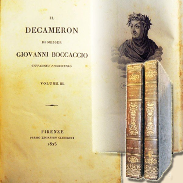 Il Decameron di messer Giovanni Boccaccio cittadino fiorentino, Leonardo Ciardetti, Firenze 1825, 4 voll. legati in due tomi, pp. 1107, un ritratto b.n. in antiporta, cm 23, elegante legatura coeva in mezza pelle con titoli e bei fregi floreali al dorso e tagli spruzzati. Lievi abrasioni agli angoli dei piatti, qualche fioritura, timbro d’appartenenza a secco al piatto interno di un volume e alla prima pagina dell’altro. Primo tomo con piccolo disegno a china alla prima pagina di guardia e all’interno del piatto posteriore. Secondo tomo con due ritratti a biro all’interno del piatto anteriore e alla prima pagina di guardia, ultima pagina staccata ma presente nel testo, piatto posteriore impercettibilmente allentato, ma legatura ancora solida. Nel complesso volumi in buono stato di conservazione, impreziositi da una bella e solida legatura.