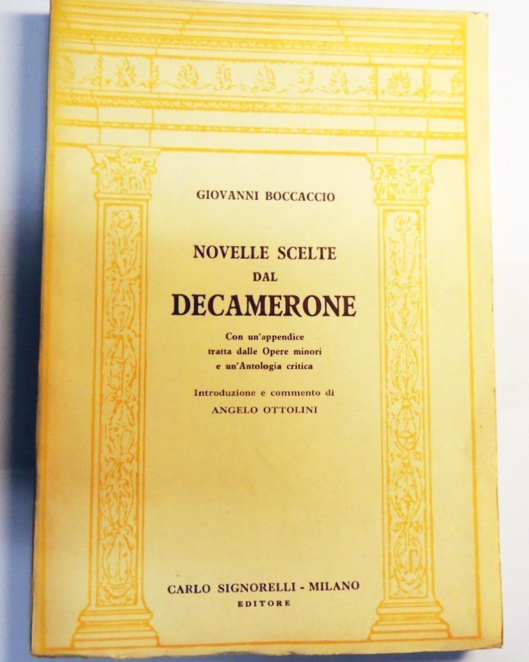 Giovanni Boccaccio, Novelle scelte dal Decamerone. Con un’appendice tratta dalle Opere minori e un’Antologia critica, introduzione e commento di Angelo Ottolini, Carlo Signorelli Editore, Milano 1953, rist., pp. 232, cm 20, br. ed. Timbro “saggio” alla copertina posteriore. Segnetto di biro all’ultima pagina, per il resto intonso.