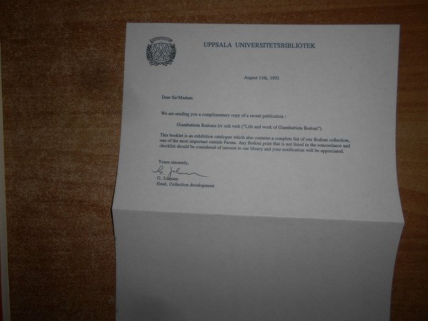 (BODONI) Giambattista Bodoni liv och verk Uppsala Universitetsbibliotek del 1992