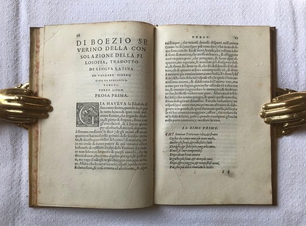 Prima edizione della traduzione in volgare fiorentino di questa celebre opera del filosofo Severino Boezio, stampata da Lorenzo Torrentino per le cure dell’umanista Benedetto Varchi.