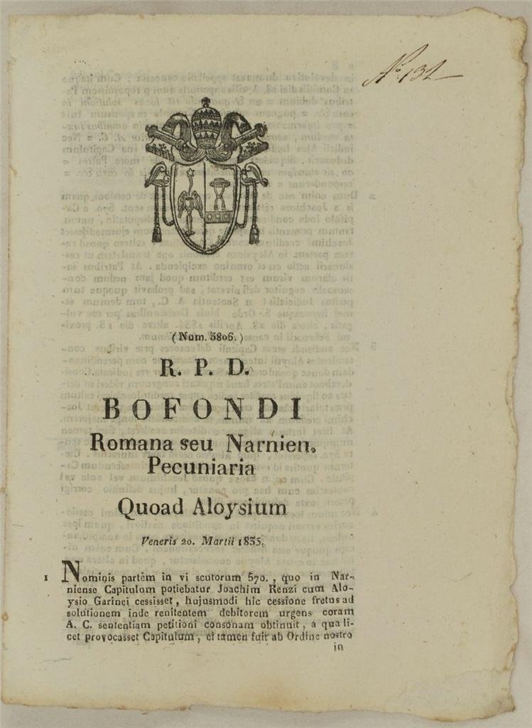 BOFONDI ROMANA SEU NARNIEN PECUNIARIA QUOAD ALOYSIUM VENERIS 20 MARTII 1835