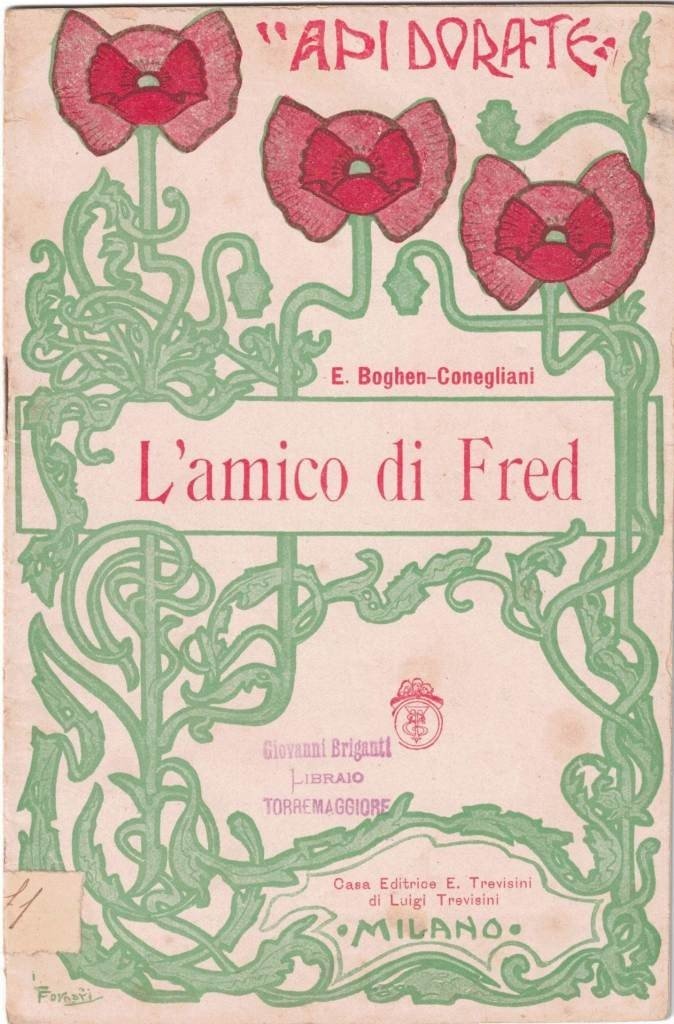 Emma Boghen-Conegliani, L’amico di Fred, acquarelli in cromo-litografia del pittore Fornari, Enrico Trevisini Editore, Milano 1902, pp. 15, 2 c. di tavv. f.t. ill. col., cm 18, rilegatura a punto metallico. Collana Api dorate. Bibliotechina settimanale illustrata, n. 30. Al dorso, piccola etichetta in carta con numero progressivo di classificazione. Alla prima di copertina, piccolo timbro: Giovanni Briganti Libraio Torremaggiore. Minime fioriture, leggere tracce d’uso, per il resto ben conservato. Estremamente raro.