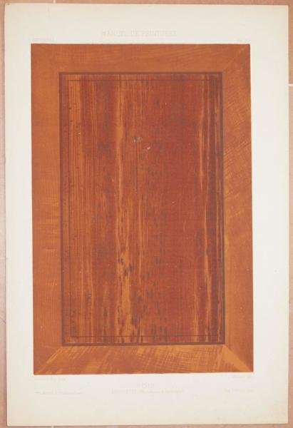 Bella cromolitografia del 1866 circa tratta dal "Journal manuel de peintures appliques a la decoration" diretto da Pierre Chabat per la decorazione di interni. L'incisione mostra un tipo di legno. In buone condizioni. TECNICA: Cromolitografia AUTORE: Massot DIMENSIONI FOGLIO: cm 46x31 DIMENSIONI INCISIONE: cm 36x24 EPOCA: 1866 circa CONDIZIONI: Buone condizioni, qualche fioritura e strappo marginale. Beautiful chromolythography of 1866 circa taken from the "Journal manuel de peintures appliques a la decoration" directed by Pierre Chabat for internal decoration. The planche shows a kind of wood. In good conditions. TECHNIQUE: Chromolytography AUTHOR: Massot PAGE SIZE: cm 46x31 PRINT'S SIZE: cm 36x24 PERIOD: 1866 circa CONDITION: good conditions with some foxings and tears in the edges<BR>