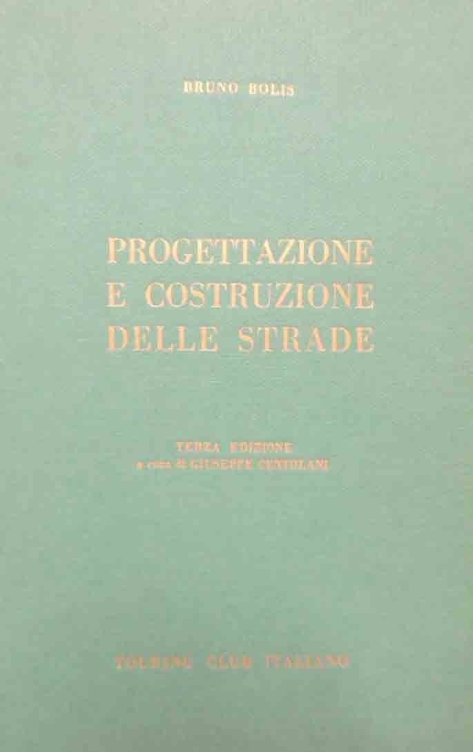 Bruno Bolis, Progettazione e costruzione delle stade, Touring Club Italiano, Milano 1969, terza ed. aggiornata e ampliata a cura di Giuseppe Centolani, pp. 461, ill. b.n, cm 23, cartone ed. con titoli al dorso e al piatto. Firma d’appartenenza alla prima carta di guardia. Minima ingiallitura della carta, lievi fioriture ai tagli, per il resto buona copia.
