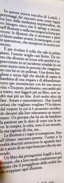 In questa nuova raccolta di Lodoli, i personaggi dei racconti sono come legati tra loro dalla medesima inquietudine, da un bisogno cieco che li spinge a cercare nell'illusione o nella menzogna la forza per vivere: le illusioni che ci accecano e però ci fanno andare avanti, le menzogne, a volte spaventose, che riempiono la nostra esistenza.