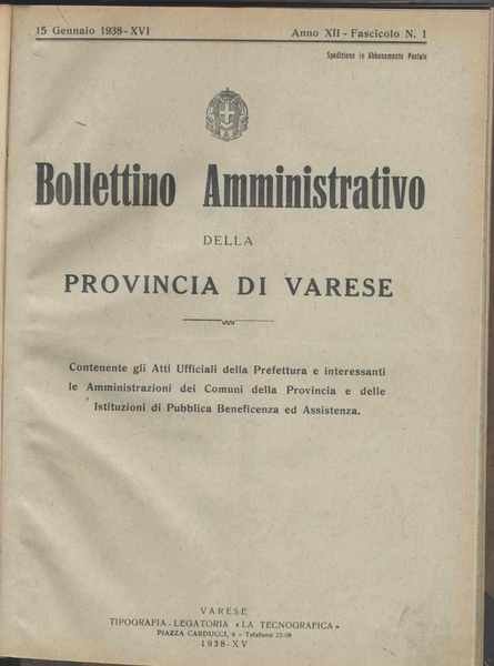 Bollettino amministrativo della Provincia di Varese annata completa del 1938 (24 fascicoli quindicinali rilegati con le copertine in fondo al tomo)