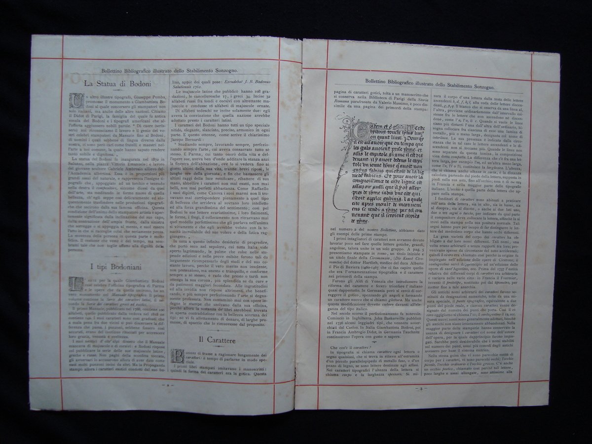 Periodico, Bollettino Bibliografico illustrato dello Stabilimento Sonzogno in Milano Anno III - N. 9- 1885 GIAMBATTISTA BODONI Sonzogno, Milano, 1885, cm 30x22, da pag. 1 a pag. 7 con illustrazioni e riproduzioni in bella grafica, miniature ed incisioni. Numero completo. Condizioni di conservazione Esemplare in buono stato, dorso da rilegatura con alcune piccole mancanze, bruniture e piccole macchiette, pag 8 con carta applicata per restauro strappetto pag 7(vedi foto) Numero completo. RVS001N00244 blu