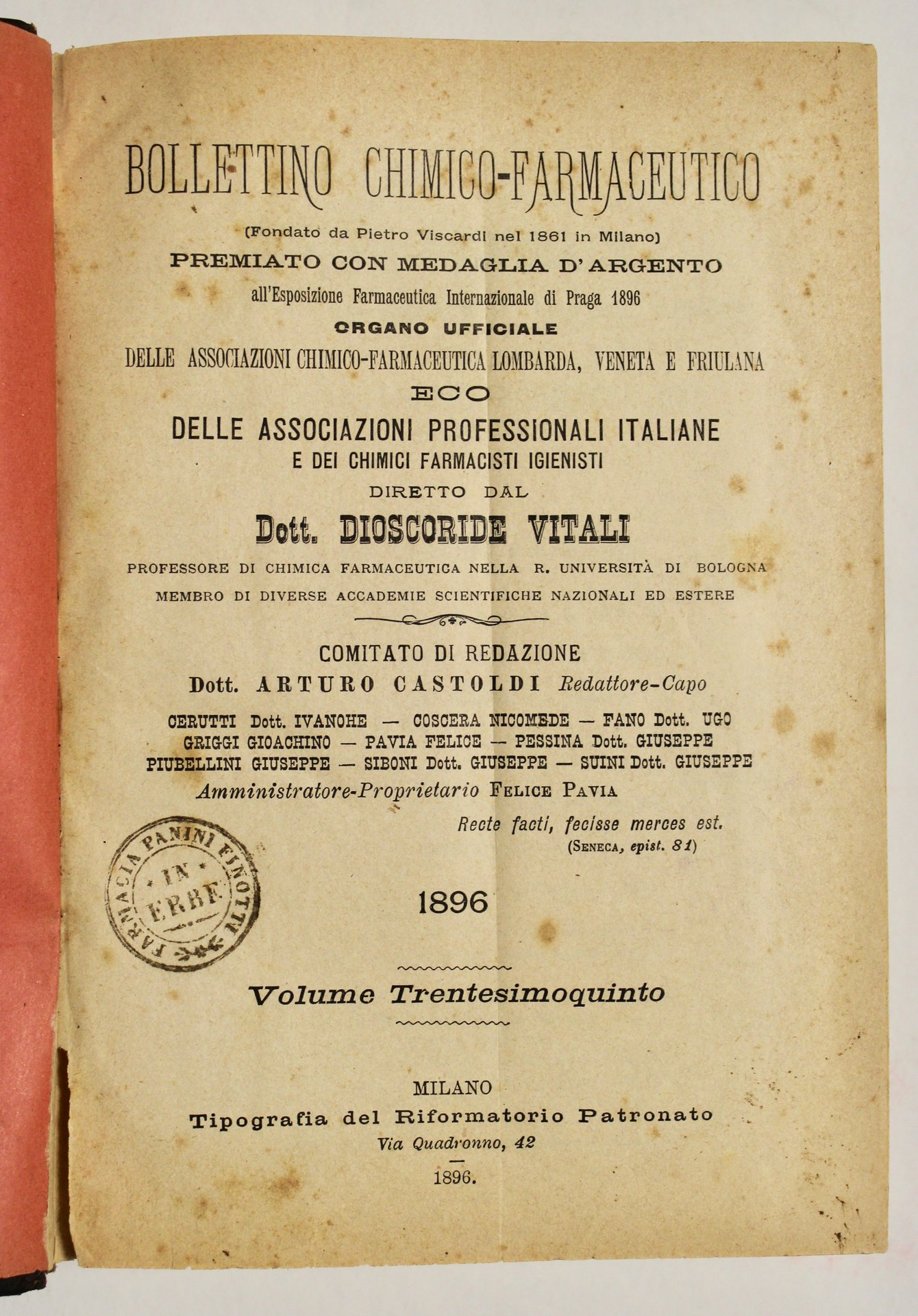 In 8°(mm 220x155) unica annata del 1896. Pagg. XX, 776. Mezza pelle coeva con titolo impresso in oro al dorso. Buon esemplare con lievi tracce d'uso a spigoli e cuffie. Timbro di appartenenza al frontespizio, lievi fioriture<BR>