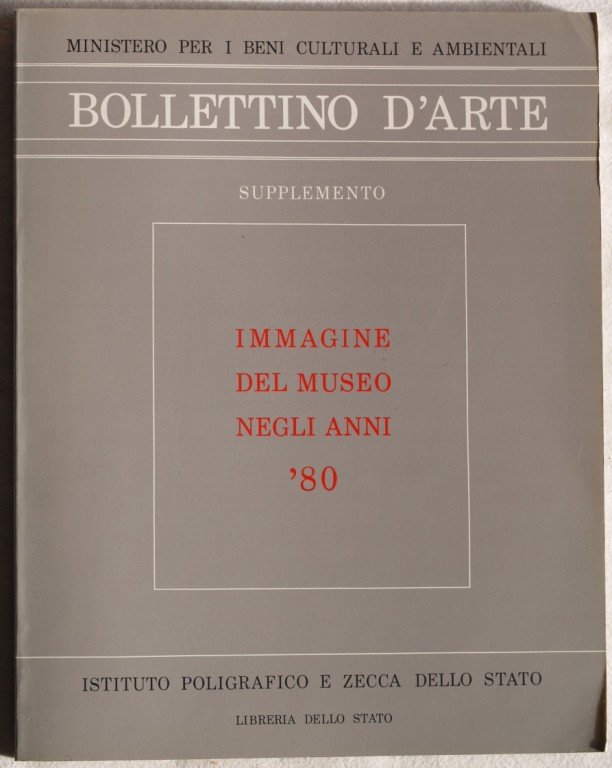 In 4. Dim. 29x22,5 cm. Pp. 110. opera completa in un volume supplemento del 1982 dei Bollettini d'arte.<BR> Il volume è dedicato ad analizzare l'immagine del museo negli anni '80.<BR>Si tratta di una serie di atti della conferenza tra musei statunitensi ed italiani promossa dal Ministero degli Affari Esteri Numerose foto a colori ed in bianco e nero ed a colori nel testo.<BR>In ottime condizioni. Brossura editoriale in ottime condizioni generali con lievi usure ai margini e dorso . complete work in one volume supplement of 1982 of the Bollettini d'arte. The volume is dedicated to the image of museum in 1980's. It is a series of acts of conferences between american and italian museums. Editorial cover in very good general conditions slightly worn in the edges and spine.