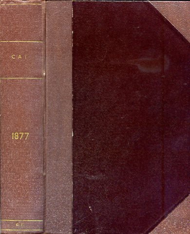 In-8° (245x161mm), pp. 648, legatura posteriore m. tela bordeaux e angoli con titolo e filetti in oro al dorso. Brossure originali conservate. Numerose tabelle n.t. e ripiegate f.t. e numerose tavv. incise f.t.: xilografia raffigurante Vezzana e Cimon della Pala, litografia seppiata molte volte ripiegata del Pisanino veduto dal Cimale sopra Gramolazzo, acquaforte con la Rognosa d'Etiache, litografia con il Pizzo Scalino e il Monte della Disgrazia, litografia con il Lago e le Torri di Fraele, litografia con la Grivola, acquaforte con la cima del Gran Paradiso, 2 grandi panorami in litografia a tinta seppia presi dal Monte Bò da disegno di E. F. Bossoli, litografia del Pian Perduto, litografia della Cima del Vettore. Aloni marginali ad alcune pp. Bell'esemplare. Annata completa per il 1877. Contributi di varii autori (Bossoli, Isaia, Vallino, Baretti, Vaccarone, ecc.) relativi, fra i moltissimi argomenti, a: Monte Mars, Val Maggia, la caccia al fagiano, alla marmotta e alla pernice in Valsesia, rimboschimenti alpini, la caccia in Svizzera, da Biella al Lago Maggiore, la Sila della Calabria, Mondovì e la grotta di Bossea, il Monte Bianco, rifugi e sentieri della Val d'Aosta, Vittorio Emanuele II cacciatore, la Val Seriana, ecc.
