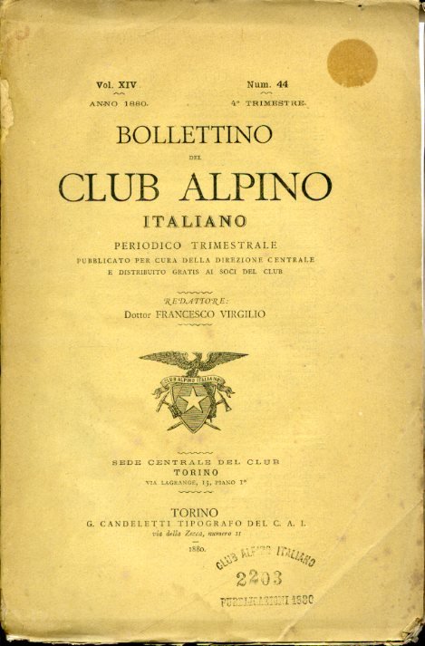 Bollettino del Club Alpino Italiano. Periodico trimestrale pubblicato per cura della Direzione centrale e distribuito gratis ai soci del Club. Vol. XIV. Num. 44. Anno 1880. 4° trimestre