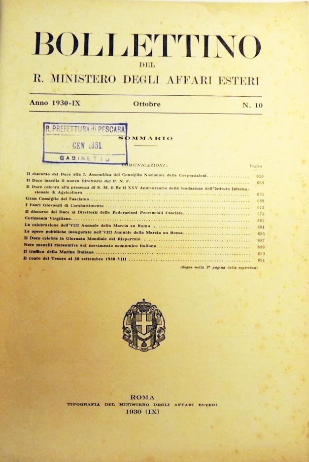 Bollettino del Ministero degli Affari Esteri, n. 10, ottobre 1930, pp. 660-769, cm 27. Sommario: Comunicazioni (Il discorso del Duce alla prima Assemblea del Consiglio Nazionale delle Corporazioni - Il Duce insedia il nuovo Direttorio del P. N. F. - Il Duce celebra alla presenza di S. M. il Re il XXV Anniversario della fondazione dell’Istituto Internazionale di Agricoltura - Gran Consiglio del Fascismo - I Fasci Giovanili di Combattimento - Il discorso del Duce ai Direttorii delle Federazioni Provinciali Fasciste - Cerimonia Virgiliana - La celebrazione dell’VIII Annuale della Marcia su Roma - Il Duce celebra la Giornata Mondiale del Risparmio - Note mensili riassuntive sul movimento economico italiano - Il traffico della Marina Italiana - Il conto del Tesoro al 30 settembre 1930 - Parte prima: Leggi e decreti - Parte seconda: Trattati convenzioni, accordi internazionali - Parte terza: Circolari, istruzioni, disposizioni varie - Parte quarta: Notiziario - Parte quinta: Massimario e giurisprudenza - Bibliografia. Timbro del Gabinetto della R. Prefettura di Pescara con data gennaio 1931. Perfetto.