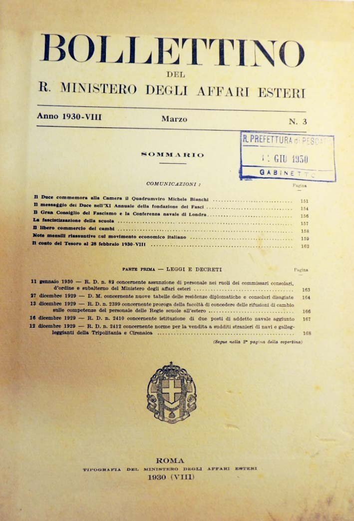 Bollettino del Ministero degli Affari Esteri, n. 3, marzo 1930, pp. 152-206, cm 27. Sommario: Comunicazioni (Il Duce commemora alla Camera il Quadrumviro Michele Bianchi - Il messaggio del Duce all’XI Annuale della fondazione dei Fasci - Il Gran Consiglio del Fascismo e la Conferenza navale di Londra - La fascistizzazione della scuola - Il libero commercio dei cambi - Note mensili riassuntive sul movimento economico italiano - Il conto del Tesoro al 28 febbraio 1930) - Parte prima: Leggi e decreti - Parte seconda: Trattati convenzioni, accordi internazionali - Parte terza: Circolari, istruzioni, disposizioni varie - Parte quarta: Notiziario - Parte quinta: Massimario e giurisprudenza - Bibliografia. Timbro del Gabinetto della R. Prefettura di Pescara con data giugno 1930. Lievissime tracce d’uso alla copertina, per il resto perfetto.