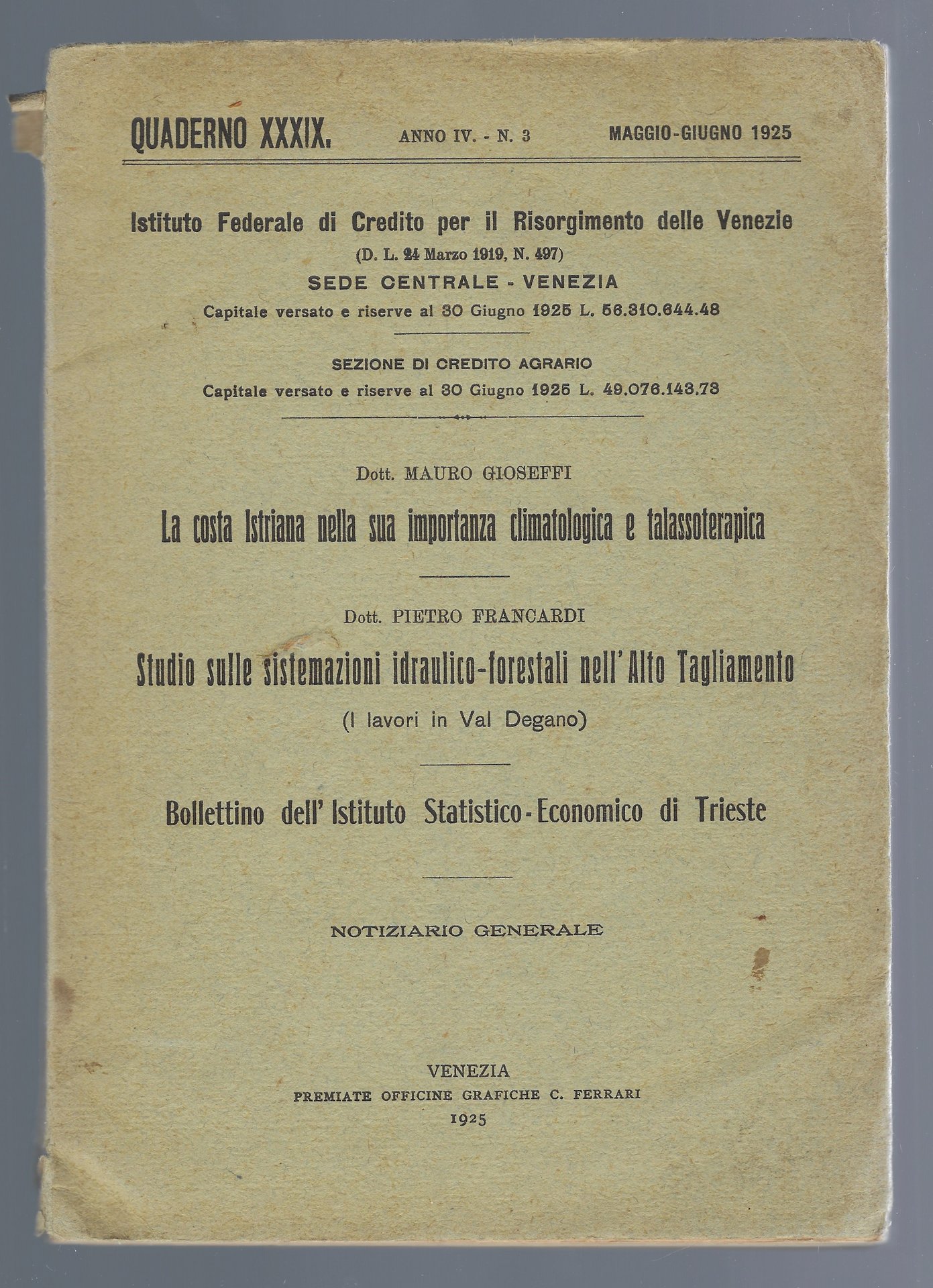 Contiene: "La costa istriana nella sua importanza climatologica e talassoterapica" di Mauro Gioseffi; "Studio sulle sistemazioni idraulico-forestali nell'Alto Tagliamento" di Pietro Francardi.
