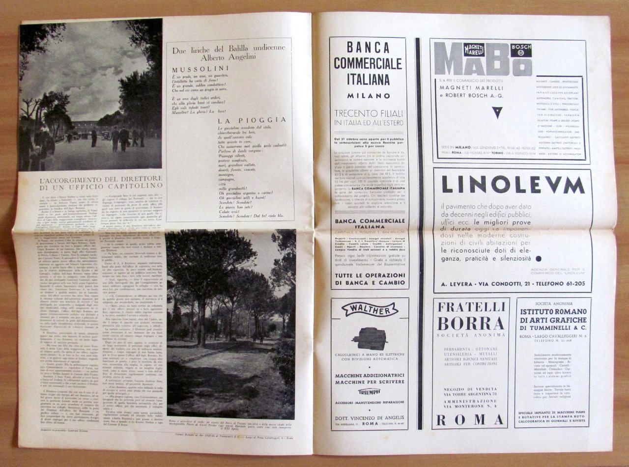 Periodico Mensile del Governatorato di Roma - Anno I - N.7 - Aprile 1936. Direttore Giuseppe Bottai. Illustrazioni fotografiche in b/n n.t. e belle pagine pubblicitarie. Ist. Arti Grafiche Tumminelli & C. - Roma, 1935. Interessantissima Rivista con apertura a giornale con avvenimenti, opere, cronache e rapporti. Sommario in copertina. Minime fioriture del tempo ai margini esterni della copertina. Chiusa 24x32 - Aperta 32x47,5; pp.16. Rara e in Ottimo stato. , Ottimo (Fine)