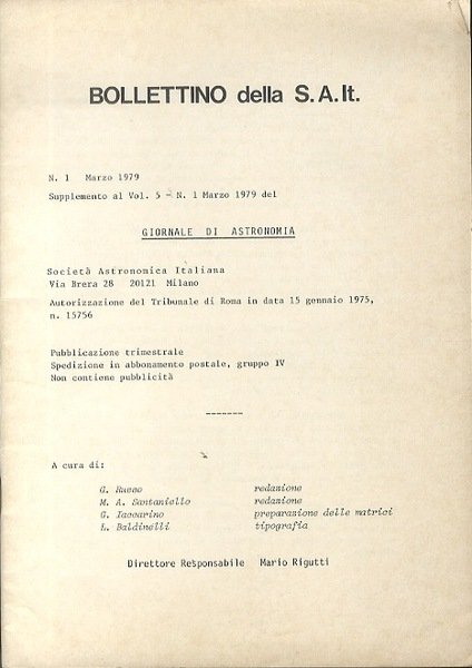 32 p., 24 cm, bross. Condizioni : USATO - Stato : Buono, ordinari segni d'uso e del tempo. Altre note : Supplemento al vol. 5 - N.1 Marzo 1979 del Giornale di Astronomia.