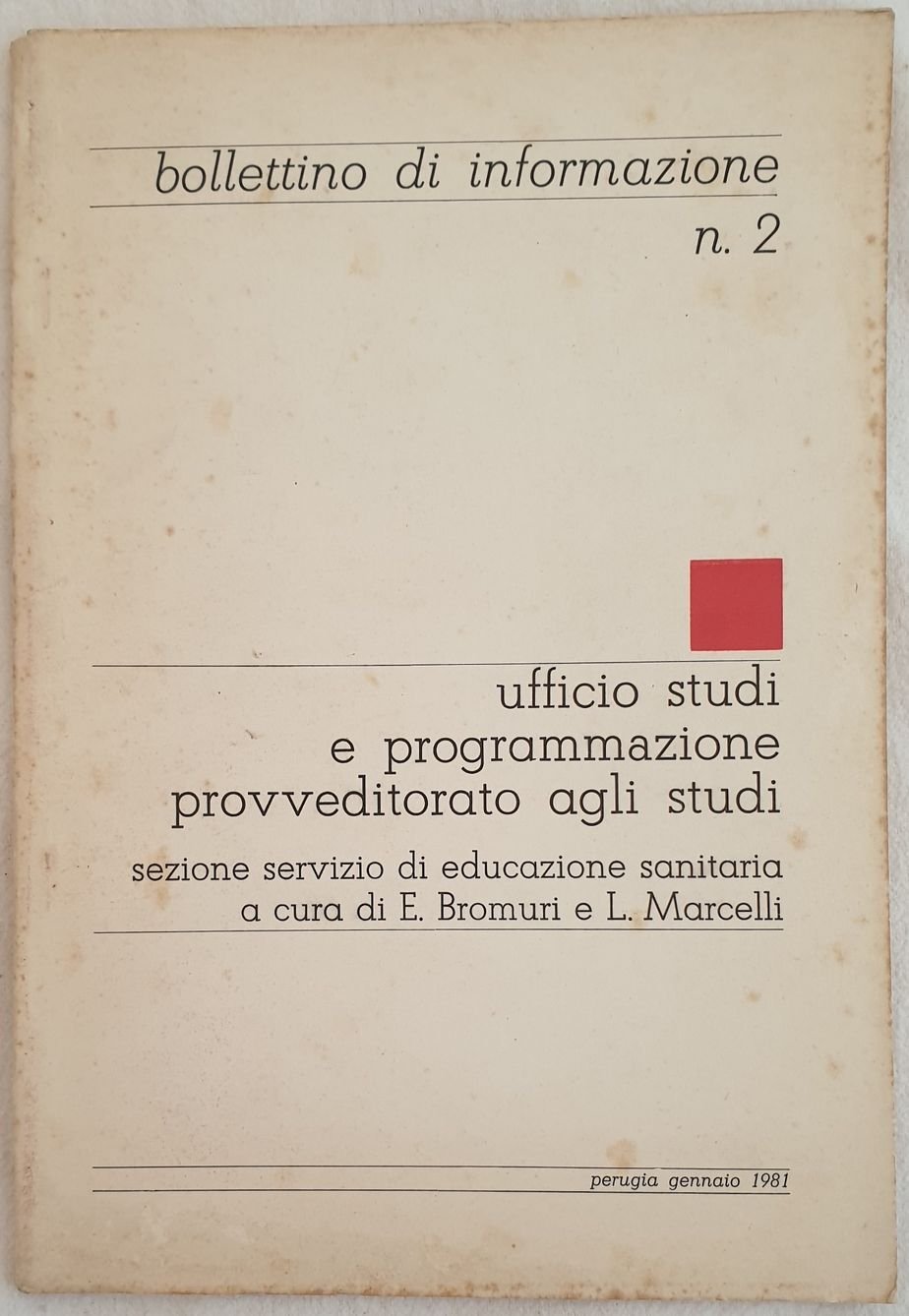 Pubblicazione del 1981 di aggiornamento agli operatori scolastici sull'educazione sanitaria a cura di E. Bromuri e Marcelli. In ottime condizioni. Brossura editoriale in ottime condizioni generali con lievi usure ai margini e dorso. Legatura in ottime condizioni. All'interno le pagine si presentano in ottime condizioni. In 8. Dim. 25x17,5 cm. Pp. 48. Pamphlet of 1981 of updating to school operators about heealth education by E. Bromuri and Marcelli.<BR>In very good conditions. Editorial cover in very good general conditions slightly worn in the edges and spine. Binding in very good conditions. Inside pages are in very good conditions. In 8. Dim. 25x17,5 cm. Pp. 48.