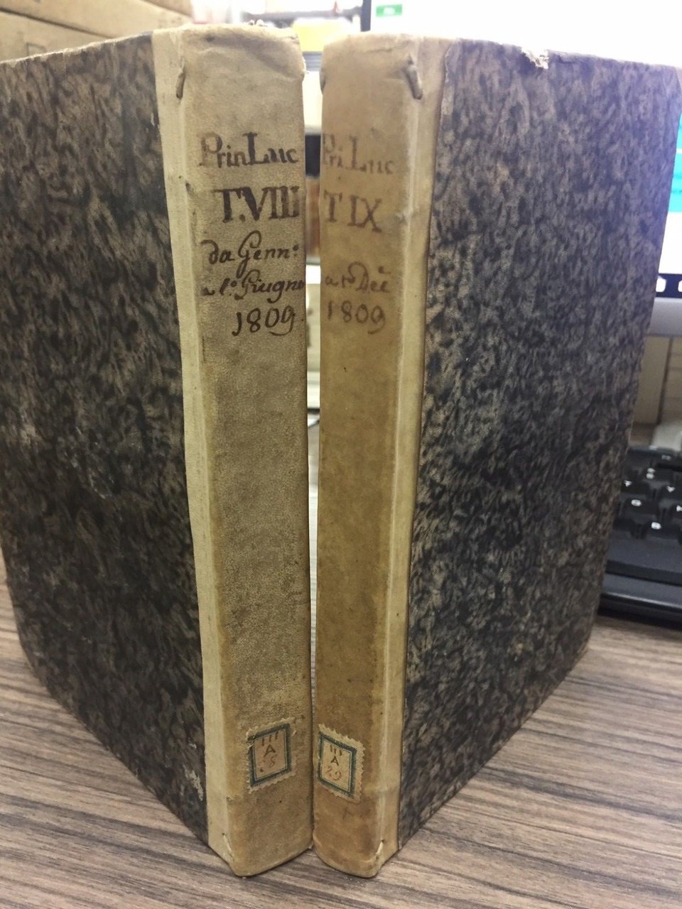 Lucca. Per Domenico Marescandoli, volumi in 16° con legatura in mz pergamena con tit. calligrafati al dorso. Segni del tempo e qualche traccia d'umido che non lede il testo se non indicato. Alcuni tomi hanno delle tavole ripiegate f.t. Disponiamo dei seguenti tomi. 1. Tomo VIII. 1809, pp. 204. 2. Tomo IX. 1809, pp. 160, manca la prima carta bianca.