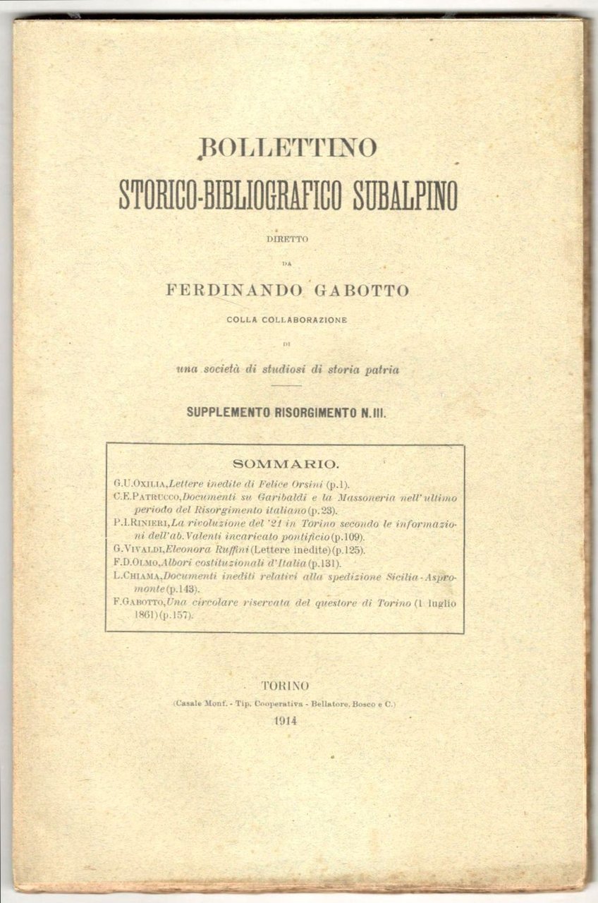 Fascicolo in 8°, pp. 160. Brossura editoriale con indice a stampa. Copia in buono stato, interamente a fogli chiusi. Fra i vari articoli si segnala: PATRUCCO, C. E. Documenti su Garibaldi e la Massoneria nell'ultimo periodo del Risorgimento italiano. - CHIAMA, L. Documenti inediti relativi alla spedizione Sicilia-Aspromonte. - GABOTTO, F. Una circolare riservata del questore di Torino (1 Luglio 1861).
