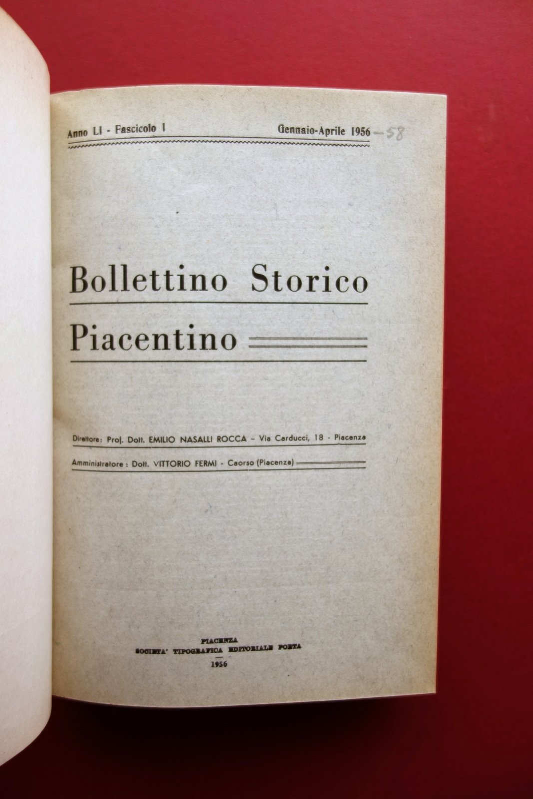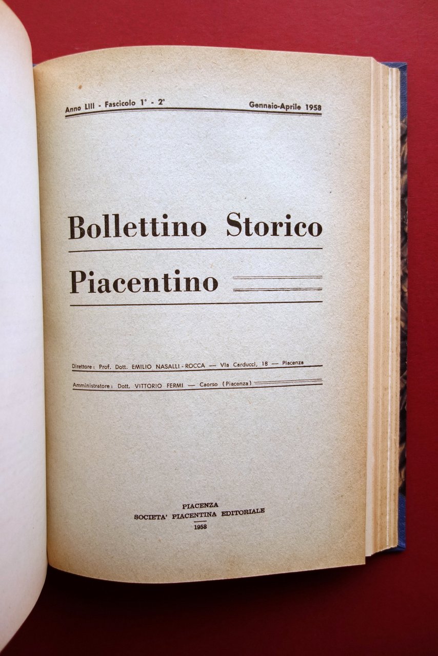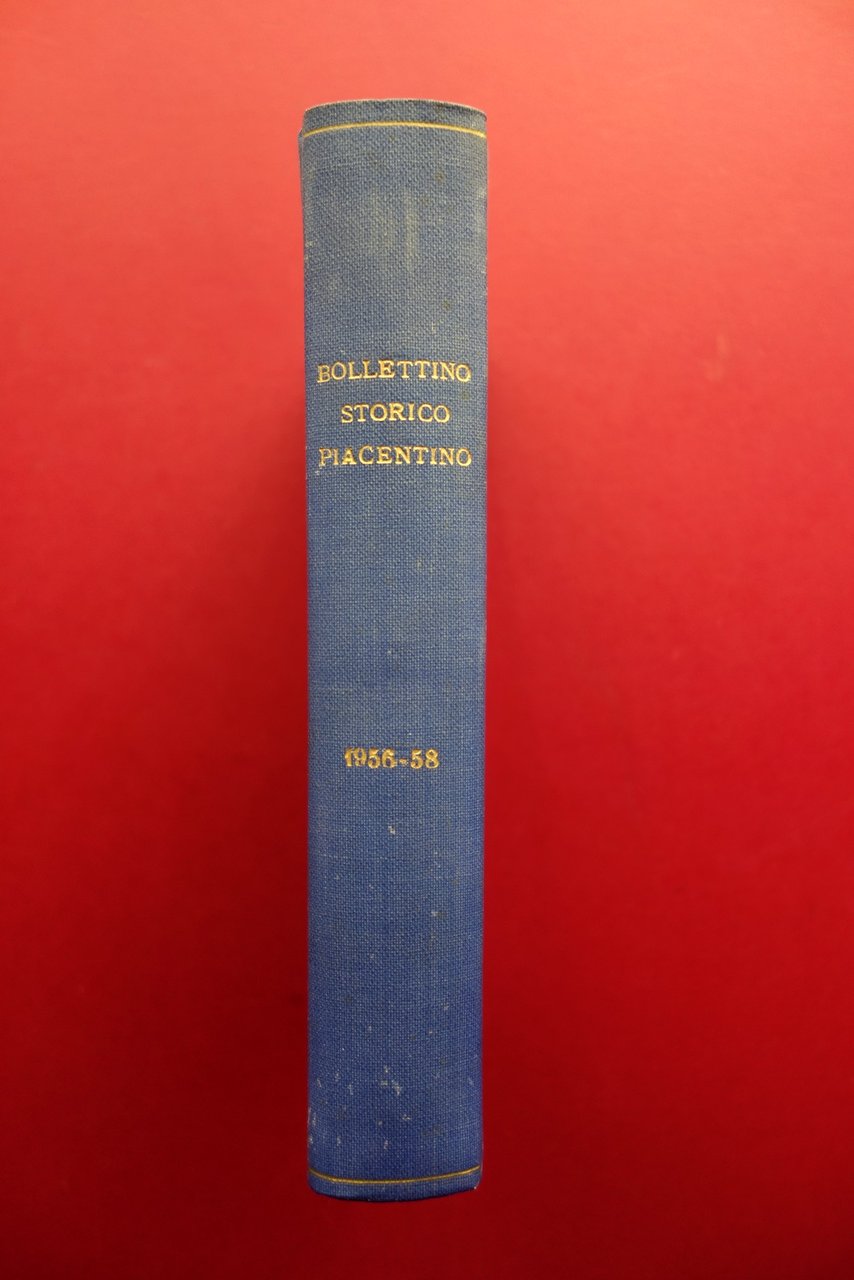 Bollettino (tre annate complete), Bollettino Storico Piacentino" anni 1956-58 tre annate complete Soc. Tip. Editoriale Porta, Piacenza 1956-58; cm 23,5x16,5; pp. 176 (1956); pp. 152 (1957); pp. 172 (1958), tutte con qualche ill. in b/n fuori t.; legatura in mezza tela con titolo al dorso, piatti marmorizzati. Tre annate complete rilegate entro un unico volume. Qualche fascicolo è corredato della brossura ed. originale, tutte ben conservate. Condizioni di conservazione Esemplare in buone condizioni con leggere tracce d'uso; poche trascurabili abrasioni al dorso e ai margini dei piatti. Interni buoni; margini delle pagine e delle copertine minimamente rifilati per rilegatura in volume. Tre annate complete rilegate entro un unico volume. Anni 1956-1957-1958. SETT138.L23557 N "