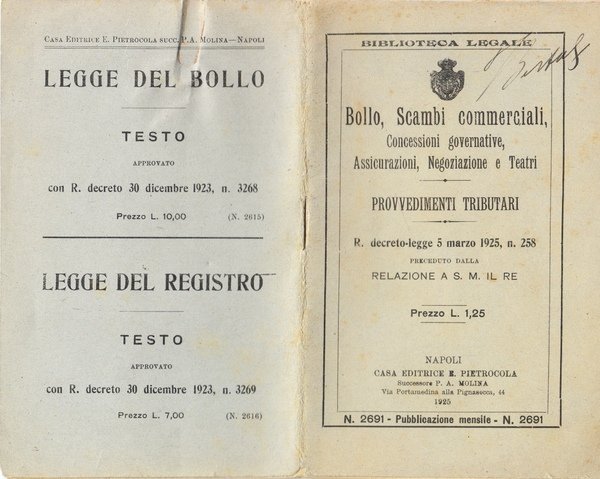 Bollo, Scambi commerciali, Concessioni governative, Assicurazioni, Negoziazione e Teatri. Provvedimenti tributari R. decreto legge 5 marzo 1925 n. 258 preceduto dalla relazione a S. M. il Re.