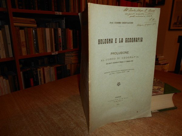 COSIMO, BERTACCHI. Firenze, Tipografia di M. Ricci, 1912. BOLOGNA E LA GEOGRAFIA. (estratto). In-8°, br. orig. 23 pp. Opuscolo ben conservato con dedica non firmata dell' Autore. Uff. A - II - 3 - 2