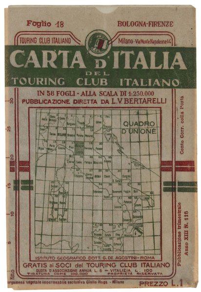 BOLOGNA-FIRENZE. Foglio 18 della CARTA D'ITALIA del T.C.I. alla scala 1:250.000.