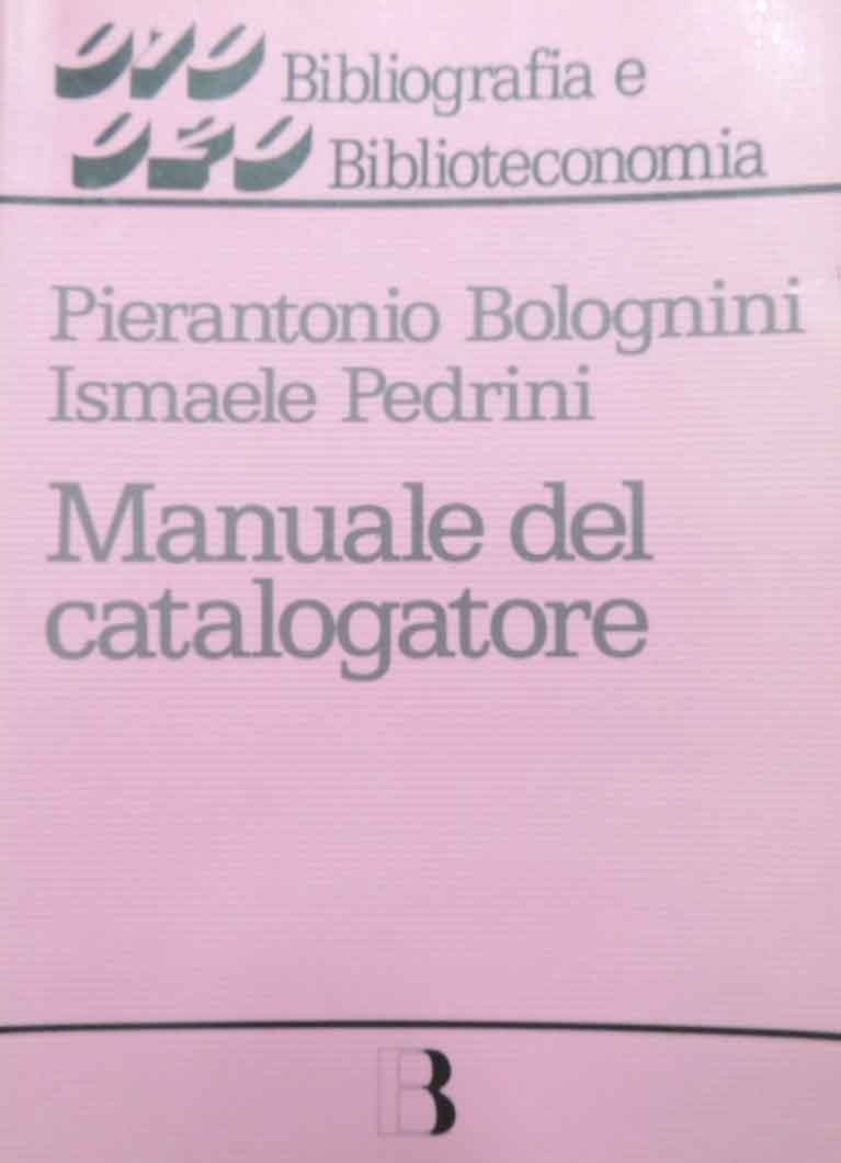 Pierantonio Bolognini, Ismaele Pedrini, Manuale del catalogatore. Una guida per le biblioteche pubbliche di ente locale, Editrice Bibliografica, Milano 1988, nuova ed. riveduta e ampliata, pp. 620, cm 24, br. ed. Collana Bibliografia e biblioteconomia. Fuori collana. Minime tracce d’uso alla brossura, lieve ingiallitura della carta, per il resto ben conservato.