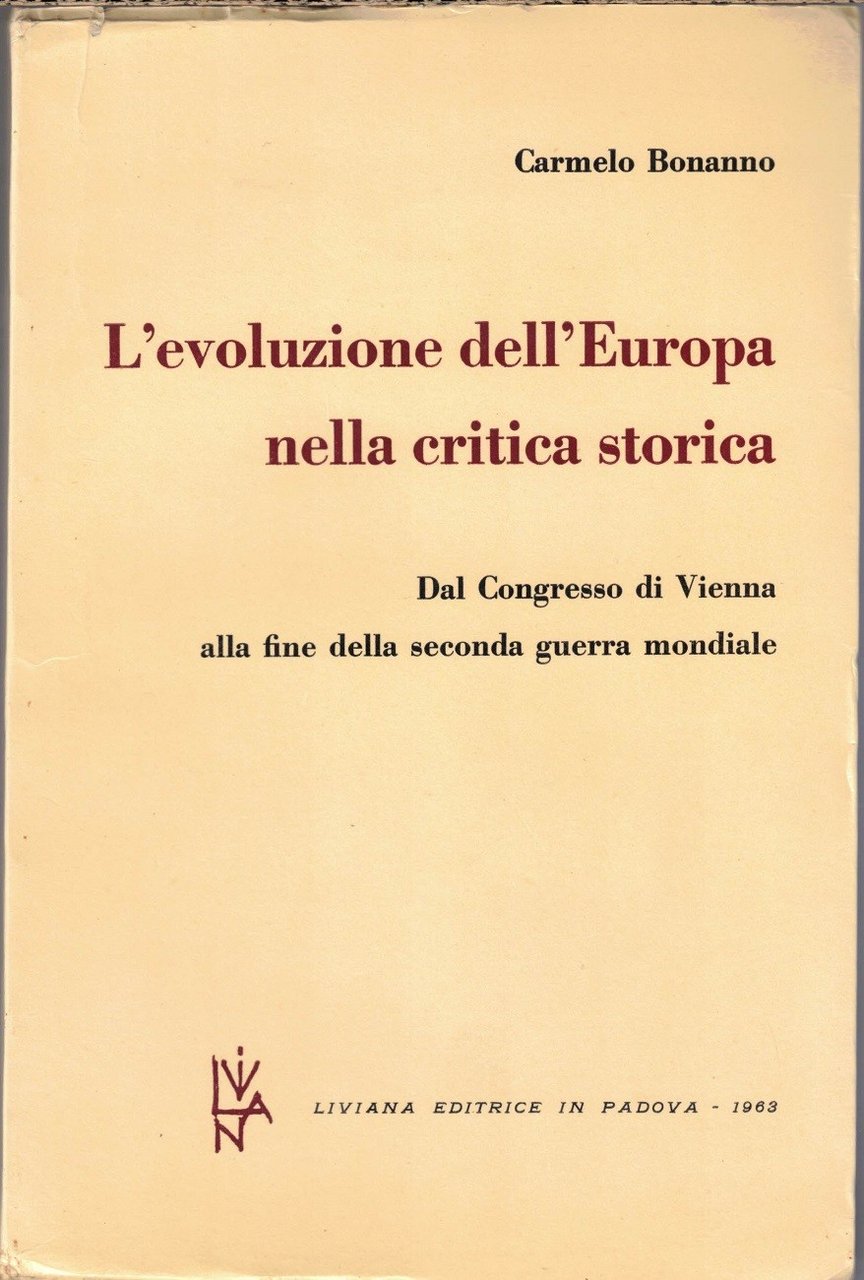 Carmelo Bonanno, L’evoluzione dell’Europa nella critica storica. Dal Congresso di Vienna alla fine della seconda guerra mondiale, Liviana Editrice, Padova 1963, pp. X, 330, cm 24, br. ed. con alette. In lotto con: Carmelo Bonanno, L’età medievale nella critica storica, Liviana Editrice, Padova 1964, pp. X, 278, cm 24, br. ed. Il lotto comprende i due volumi di Carmelo Bonanno, L’evoluzione dell’Europa nella critica storica. Dal Congresso di Vienna alla fine della seconda guerra mondiale e L’età medievale nella critica storica, entrambi ed. Liviana Editrice. Indice vol. L’evoluzione dell’Europa nella critica storica: Premessa – La civiltà del secolo XIX – Analisi del Congresso di Vienna – La politica europea dal 1815 al 1848 – Problemi del Risorgimento italiano – Problemi dei moti carbonari – Mazzini, Gioberti e il Risorgimento – Cattolicesimo e Risorgimento – La rivoluzione del 1848, prologo della storia europea – L’unificazione italiana nei contrasti dei grandi protagonisti – Il Risorgimento nei contrasti delle grandi potenze – La questione sociale nel pensiero di Mazzini, Marx e Leone XIII – L’Inghilterra e la civiltà del sec. XIX – I problemi dell’Impero asburgico – La Francia e l’Europa – L’unificazione tedesca e le sue conseguenze – La lotta sociale e politica in Russia – Analisi critica della politica interna italiana dopo il 1861 – La nuova politica europea del 1852 al 1914 – Esame della politica interna italiana dal 1876 al 1914 – L’Italia e la guerra 1915-18 – Problemi della prima guerra mondiale – Diagnosi del bolscevismo – Interpretazioni del fascismo – Il nazismo, Hitler e la Germania - La responsabilità della seconda guerra mondiale – Significato e valore della Resistenza in Italia – L’evoluzione dello Stato nell’età contemporanea – Indice per argomenti. Indice vol. L’età medievale nella critica storica: Premessa – Che cos’è il Medioevo – La civiltà romana e il Medioevo – La funzione storica del Cristianesimo – Il germanesimo nella formazione dell’Europa – L’Impero e i regni barbarici – L’Impero bizantino – L’opera dei benedettini – L’Italia sotto i Longobardi – L’opera di Gregorio Magno – Gli Arabi e l’Europa – Il potere temporale dei papi – L’opera di Carlo Magno – Il dissolvimento dell’Impero carolingio – Feudalismo vecchio e nuovo – L’età ferrea del Papato e l’Impero Germanico – La rinascita dell’Europa e la lotta delle investiture – I Normanni in Italia – L’Italia dei Comuni – La riconquista europea del Mediterraneo: Repubbliche marinare e Crociate – La politica di Federico Barbarossa – Enrico VI e Innocenzo III – Federico II di Svevia – La guerra del Vespro – La teocrazia papale contro gli Stati nazionali – Il problema del passaggio dal Comune alla Signoria – La politica degli Stati italiani del 1300 al 1454 – Le Signorie nella Storia d’Italia – La crisi della Chiesa – L’Italia bilanciata – La questione della crisi italiana – Problemi e aspetti italiani delle scoperte geografiche. Ordinarie tracce d’uso, fioriture al taglio superiore del primo volume, leggera brunitura della carta, per il resto esemplari in buono stato di conservazione, con brossure solide e interno ben tenuto e di piena fruibilità.