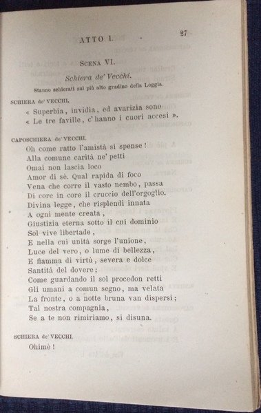 17,6x11,6 cm; 96 pp. Brossura grigia. Prima edizione di questa tragedia del filosofo, avvocato, scrittore, insegnante di filosofia, patriota, deputato, redattore, membro dell'Accademia della crusca, musicista originario di San Miniato al Tedesco, Augusto Conti. Antico timboro di appartenenza privata di un Telegrafista modenese al margine bianco frontespizio. All'interno OTTIMO stato di conservazione.