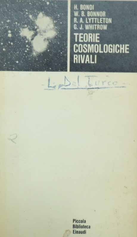 H. Bondi et al., Teorie cosmologiche rivali, Giulio Einaudi Editore, Torino 1965, pp. XXVI, 78, 8 c. di tavv. f.t. ill. b.n., cm 18, br. ed. Collana Piccola Biblioteca Einaudi, n. 55. Autori: H. Bondi, W. B. Bonnor, R. A. Lyttleton, G. J. Whitrow. Firma d’appartenenza alla prima di copertina e al frontespizio. Tracce d’uso, fioriture, minima brunitura della carta, ma nel complesso ancora buona copia.