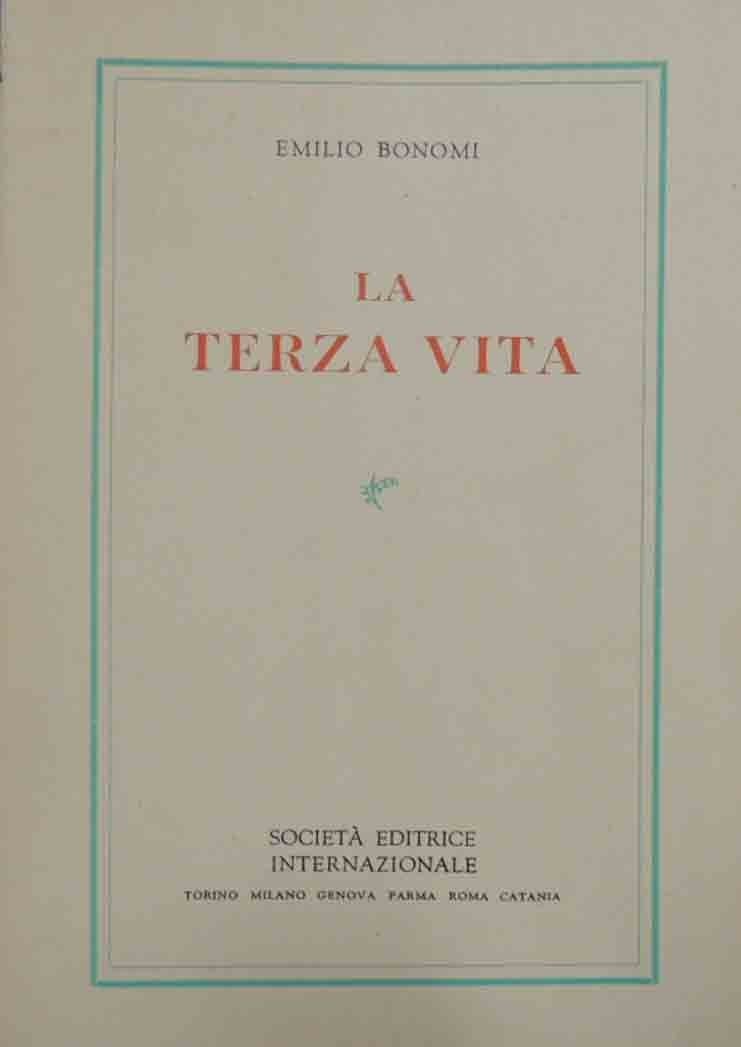 Emilio Bonomi, La terza vita, SEI Società Editrice Internazionale, Torino 1954, pp. 248, cm 19, br. ed. Timbro Omaggio alla prima pagina di guardia. Una minima traccia di piegatura alla brossura, lievissima brunitura della carta, per il resto perfetto.