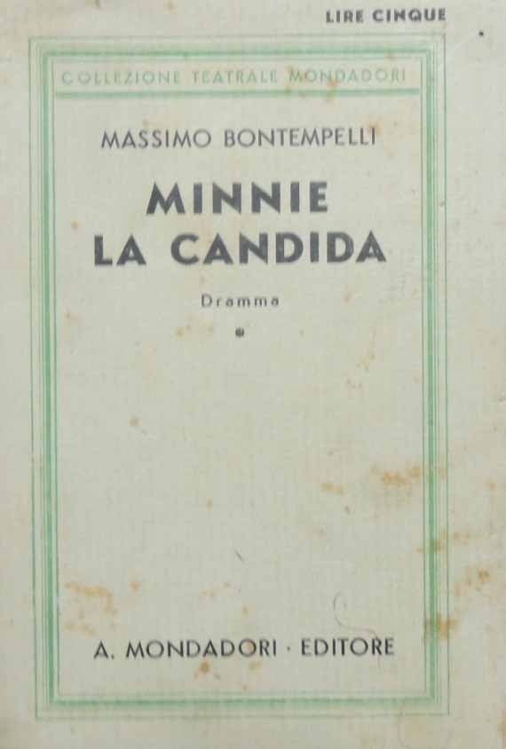 Massimo Bontempelli, Minnie la candida. Dramma, A. Mondadori, Milano 1929, pp. 156, cm 19, br. ed. Collana Collezione Teatro Mondadori. Numero progressivo di classificazione manoscritto al dorso e alla prima carta bianca. Tracce d’uso, fioriture, minima brunitura della carta, ma nel complesso volume in condizioni ancora accettabili e perfettamente fruibile.