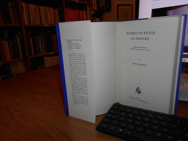 JOHN PARKER. Amsterdam, N. Israel, 1965. Books to Build an Empire. A Bibliographical History of English Overseas Interest to 1620. In-8°, tela edit. bleu con titolo in oro al dorso, sovracopertina. viii, 290 pp. con una carta più volte ripiegata f.t. Ottimo stato. Uff. B - I - 6