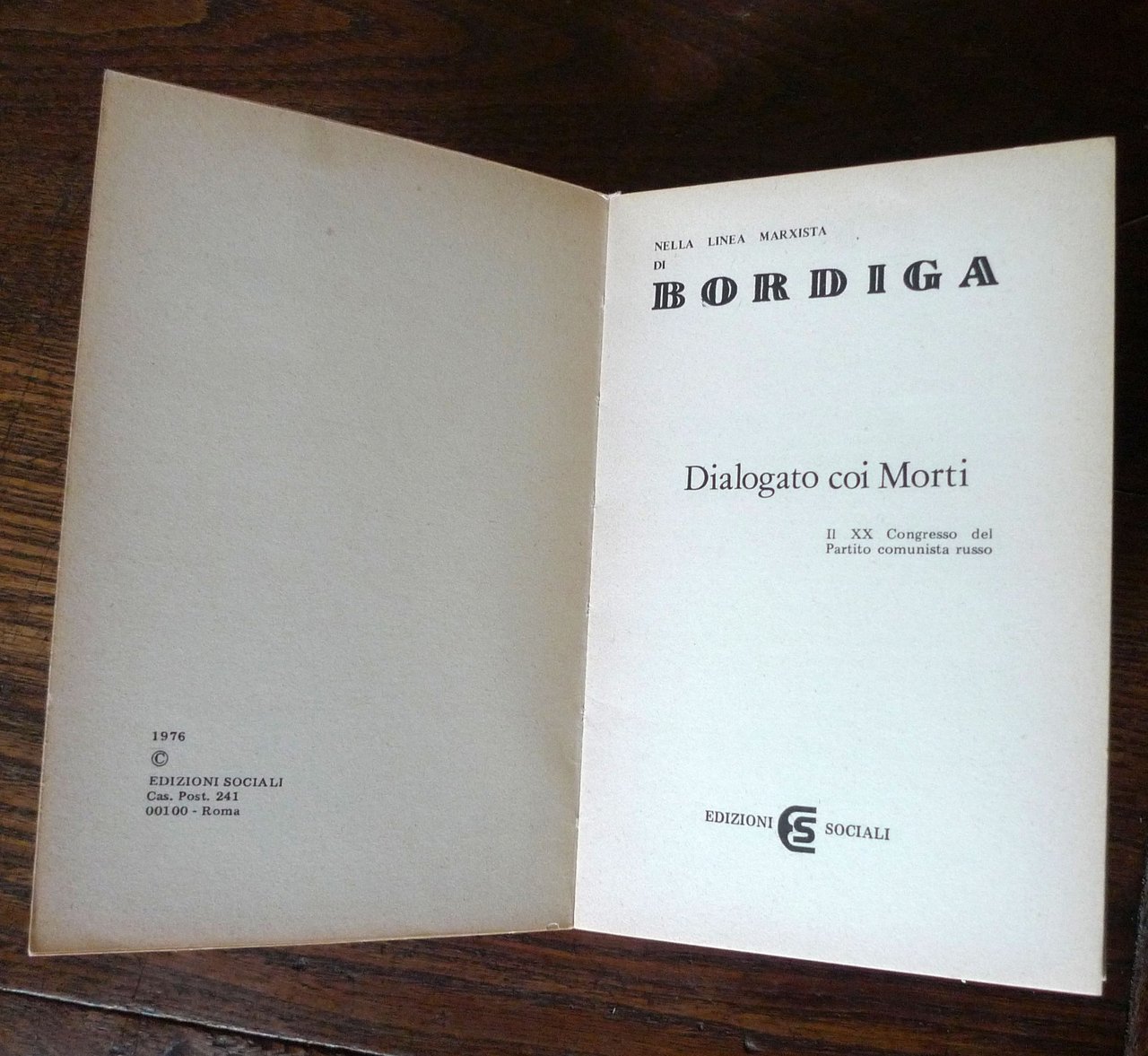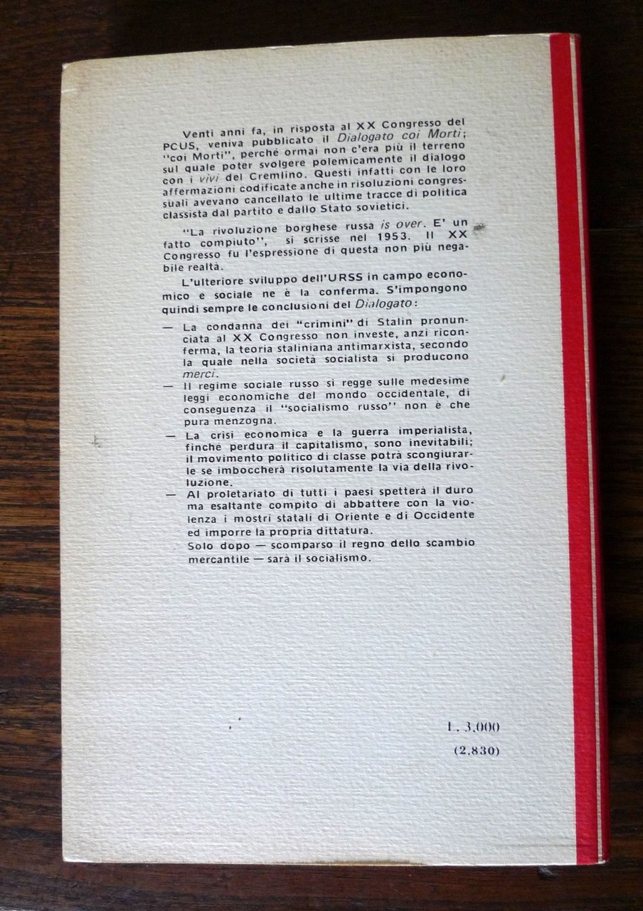 Nella linea marxista di BORDIGA.DIALOGATO COI MORTI.IL XX CONGRESSO DEL PARTITO COMUNISTA RUSSO.Edizioni Sociali, Roma 1976, brossura, 17x10,5 cm., pp.236,peso: g.300cod.9925CONDIZIONI DEL LIBRO: buone,pagine ingiallite