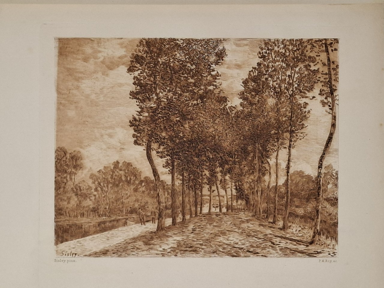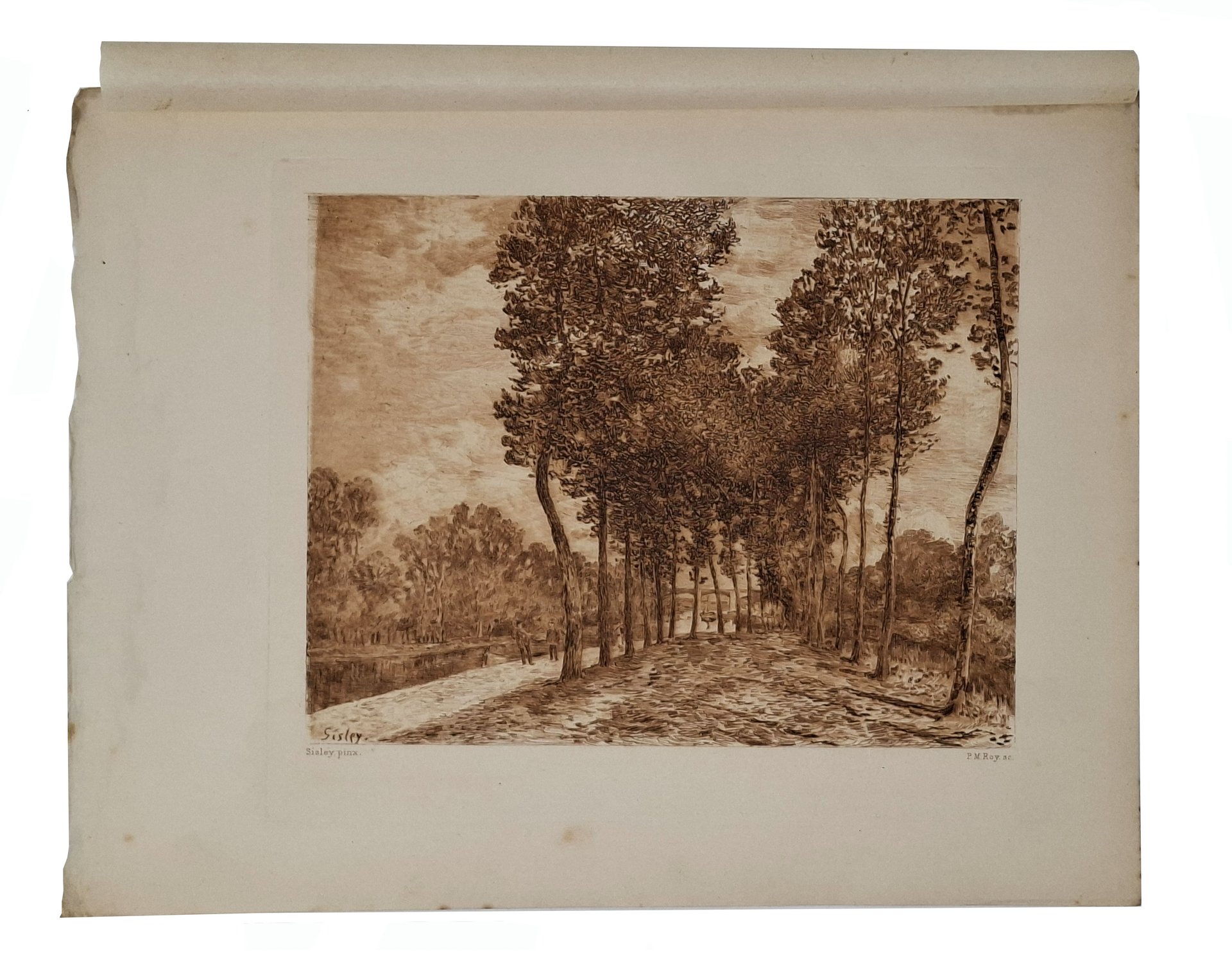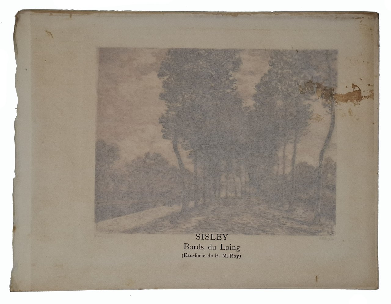 Incisione originale, su foglio in carta spessa di dimensioni 26 x 20, tratta dall'opera francese 'Les Peintres Impressionistes' di Théodore Duret (Paris, H. Floury libraire-éditeur) del 1906. L'esemplare da cui è stata tratta questa acquaforte appartiene all'edition de luxe' ed è l'esemplare n° 85 (sui 100 esemplari numerati) 'sur papier du Japon'. L'incisione, su carta spessa, è protetta da un foglio di velina trasparente. Autore e titolo dell'opera stampati sul foglio di velina. Stato di conservazione: si segnala unicamente un ingiallimento / brunitura sulla velina ma, nel complesso, un ottimo esemplare. Acquaforte firmata in lastra da Sisley.