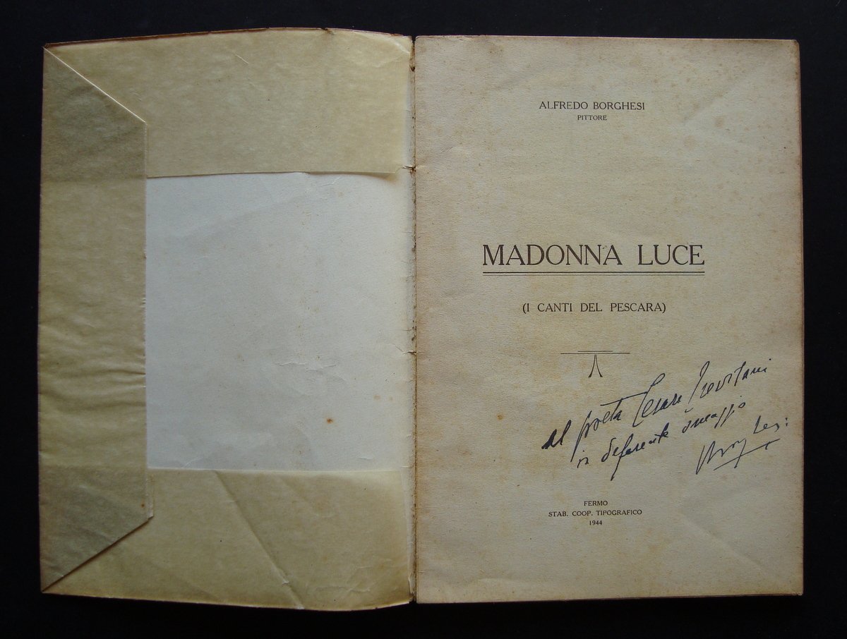 Borghesi A., MADONNA LUCE (I CANTI DI PESCARA) Stab.Coop.Tipografico, Fermo, 1944, cm 22 x 15, pp.69, br.in cartoncino muto con sovracoperta in carta velina illustrata blu, allegata 1 tavola in b/n di un quadro dello stesso Borghesi, dedica autografa dell'autore al poeta Cesare Trevisani (vedi foto) Condizioni di conservazione. Esemplare in buono stato con legger tracce d'uso e del tempo, piccoli strappetti e piccole mancanze al dorso sia della sovraccoperta che della br., interni leggermente ingialliti, qualche piccola macchietta al contropiatto, leggerissime annotazioni a matita (rimovibili) in alcune pagine. OPEB.3012 BLU