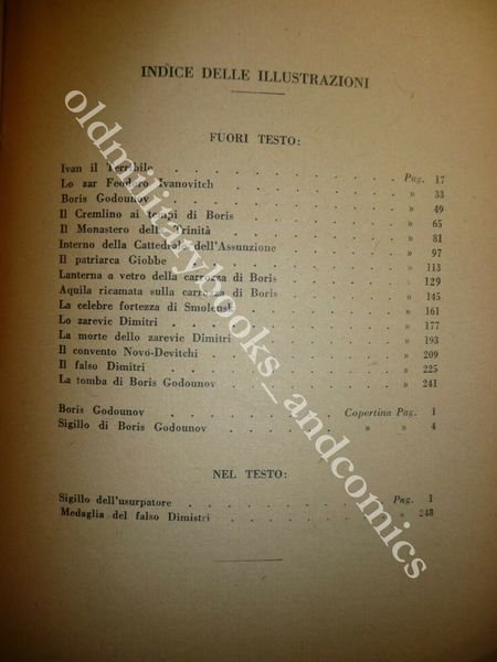 DESCRIZIONE: Corbaccio Milano 1931, br. ed. ill., pp. 247 ill. b/n f.t. in 8°. La personalità di Boris Godounov ha costantemente occupato lattenzione degli storici e dei letterati. Nel gran dramma storico moscovita della fine del XVI e del principio del XVII secolo, Boris ha sostenuto, volta a volta, la parte di conquistatore e quella di vittima; le sue qualità personali, come le sue azioni, suscitarono nei contemporanei suoi stessi talvolta elogi spinti fino al panegirico, talaltra biasimi degeneranti in odiose calunnie. CONDIZIONI: Discrete, vol. con segni di sporco e strappetti, prime pagine stropicciate. PESO / WEIGHT: 400 gr. without package