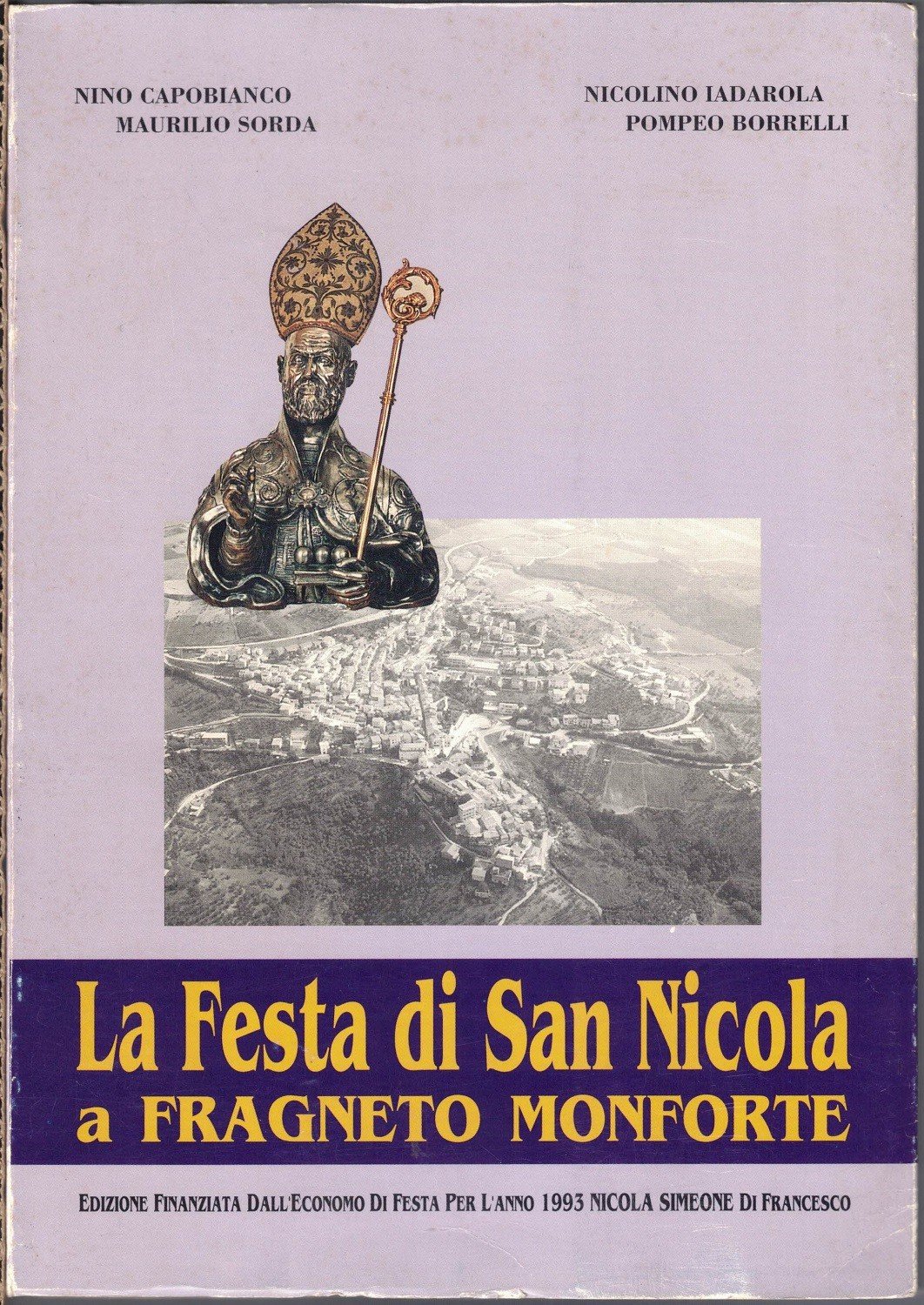 La festa di San Nicola a Fragneto Monforte. Testi di Pompeo Borreli et al., raccolta testi e impaginazione a cura di Nino Capobianco, fotografia di Enzo Simeone e Carmine Zotti, fototeca di Fiabiano Ullo et al., s.n., s.l. (ma stampato a Foglianise, presso la Serigraf Sannita s.n.c.) 1993, prima ed., pp. 154, ill. b.n., cm 24, br. ed. con alette. Collana Farnia (promossa e finanziata dalla Biblioteca Comunale di Fragneto Monforte), 1. In calce al frontespizio: Edizione finanziata dall’economo di festa per l’anno 1993. Indice: Maurilio Sorda, San Nicola di Bari: agiografia – Nino Capobianco, Le origini della festa di San Nicola a Fragneto Monforte secondo la tradizione popolare – Nicolino Iadarola, Pro-memoria della festa di San Nicola che ogni anno si svolge a Fragneto Monforte – Pompeo Borrelli, Nino Capobianco, Calendario della festa di San Nicola – Nino Capobianco, Curiosità storiche. Attività tramandate e conservate per la Festa di san Nicola – Appendice. Albo degli economi di festa a partire dal 1874. Alla prima carta, dedica manoscritta. Leggere tracce d’uso alla brossura, minima ingiallitura della carta, per il resto ottimo esemplare.