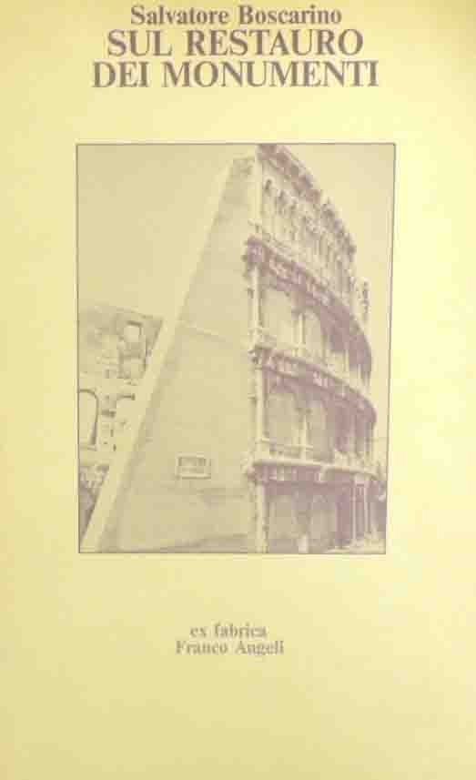Salvatore Boscarino, Sul restauro dei monumenti, Franco Angeli, Milano 1985, pp. 250, 28 c. di tavv. f.t. ill. b.n., cm 22, br. ed. Qualche sporadica sottolineatura a evidenziatore, lieve ingiallitura della carta, per il resto buona copia.
