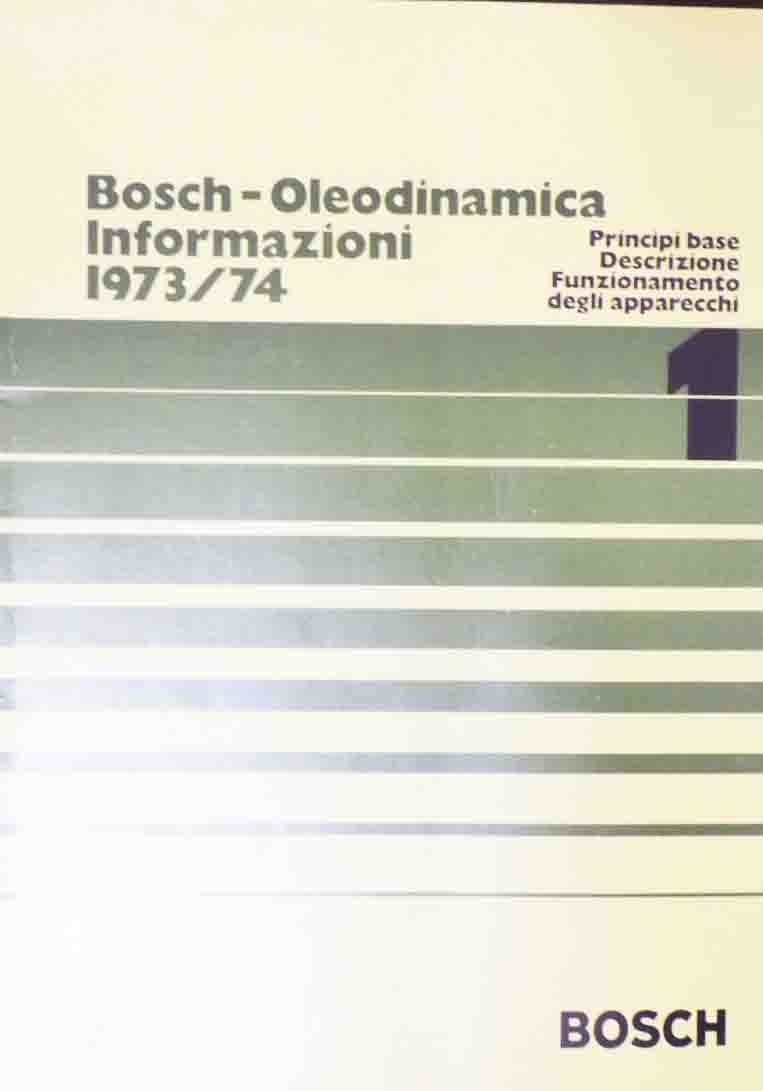Bosch-Oleodinamica. Informazioni 1973/74. 1. Principi base. Descrizione. Funzionamento degli apparecchi, Bosch, Milano s.d. (1973?), pp. 103, ill. b.n. e col., cm 30, br. ed. Leggere tracce d’uso, per il resto ben conservato. Estremamente raro.