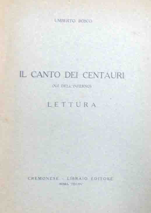 Umberto Bosco, Il canto dei centauri (XII dell’Inferno). Lettura, Cremonese Libraio Editore, Roma 1937, pp. 19, cm 24, opuscolo spillato. Dedica manoscritta dell’autore al frontespizio. Leggere tracce d’uso, lievi bruniture, per il resto ben conservato. Raro.