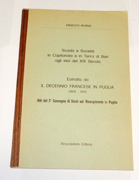 Ernesto Bosna, Scuola e società in Capitanata e in Terra di Bari agli inizi del XIX Secolo, Bracciodieta Editore, s.l. s.d. (1979?), pp. 192-224, cm 24. Estratto da Il decennio francese in Puglia (1806-1815). Atti del 2° Convegno di Studi sul Risorgimento in Puglia. Il Convegno si è svolto nei giorni 12-14 ottobre 1979. Invio autografo dell'autore al frontespizio.