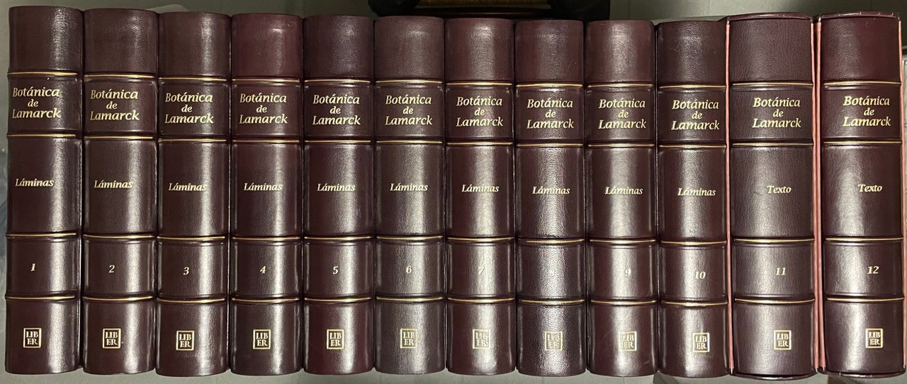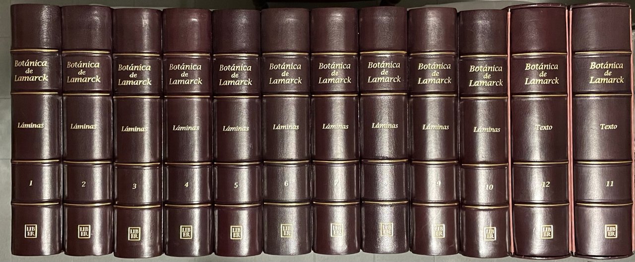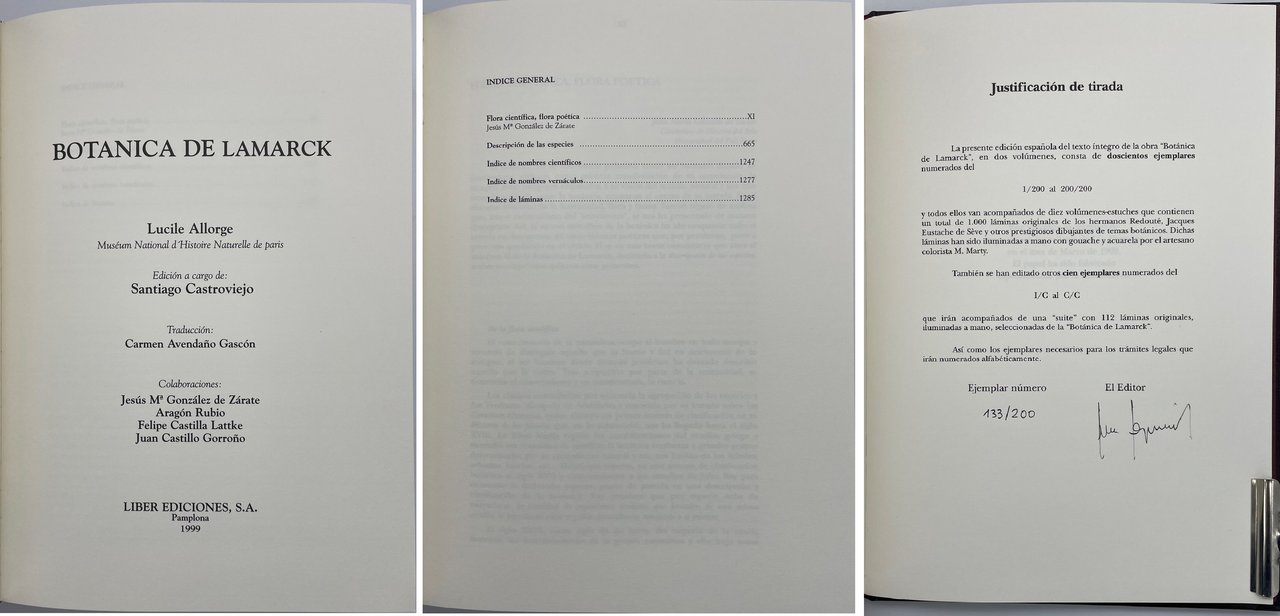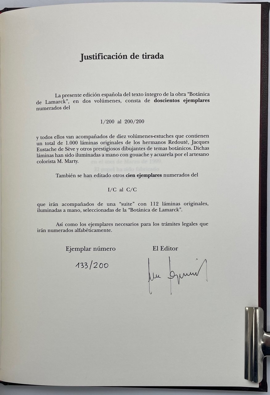 Botánica de Lamarck. Liber Ediciones, Pamplona, 1995. Traduzione di Santiago Castroviejo, illustrazioni di Pierre Joshep Redouté/Fossier. 12 volumi; dieci contengono mille tavole (tutte le specie illustrate da Lamarck); 2 volumi contengono i testi con le descrizioni complete delle 2.900 specie illustrate, oltre a indici e saggi. La definizione dei colori è stata eseguita, manualmente, mediante “pochoir” dal miniaturista Michel Marty, con tempera e acquerello, che garantisce, oltre alla difficoltà e rarità, la durata e il valore delle stampe; la carta utilizzata è la "vélin d'arches" di 250 grammi. Legatura in pelle di capra, bordeaux, con doratura a secco. L'edizione originale spagnola è limitata a 200 copie numerate e autenticate. Condizioni ottime (quasi nuovo). Botanica de Lamarck. Liber Ediciones, Pamplona, 1995. Translation by Santiago Castroviejo, illustrations by Pierre Joshep Redouté/Fossier. 12 volumes; ten contain a thousand plates (all species illustrated by Lamarck); 2 volumes contain the texts with complete descriptions of the 2,900 illustrated species, in addition to indexes and studies. The definition of the colors was carried out manually, using "pochoir" by the miniaturist Michel Marty, with tempera and watercolor, which guarantees, in addition to the difficulty and rarity, the duration and value of the prints; the paper used is the "vélin d'arches" of 250 grams. Goatskin binding, burgundy, with embossed gilding. The original Spanish edition is limited to 200 numbered and certified copies. Very good condition (almost new).