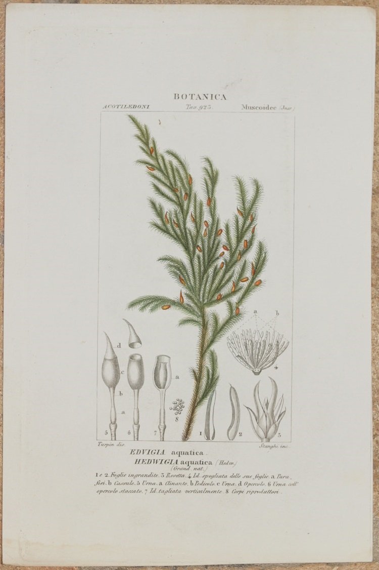 Eccellente incisione creata dal maestro Pierre Jean Francis Turpin. Le scritte indicanti la specie e la descrizione della pianta o animale sono in italiano e/o latino, e provengono dalla prima edizione italiana del Dizionario di scienze naturali edito da Battelli nel 1831. Quest'opera imponente era composta da 29 volumi ed era corredata da centinaia di incisioni che rappresentavano tutto il mondo animale e vegetale. L'opera deriva da un eccellente lavoro di luminari del XVIII secolo supportati dal Re francese Louis XV in seguito guidati dallo stesso Turpin, considerato al tempo il più grande incisore di botanica. La maggior parte delle incisioni sono firmate Turpin & Pretre. Le incisioni sono veramente eccezionali con una grande dovizia di particolari e dipinte a mano. Carta bianchissima e resistente di ottima qualità. Formato foglio: cm 25x17. Formato incisione: cm 15x9 Autore: Stanghi su disegno di Turpin In buone condizioni, gore d'umidità al margine inferiore. Superb engraving made by the master Pierre Jean Francis Turpin. The engravings are written in latin and italian and come from the first italian edition of Dictionary of natural sciences edited by Battelli in 1831. This imponent work was made up by 29 volumes and contained hundreds of engravings that represented all the plant and animal kingdom. This work derives from an excellent work of luminaries of the 18th century supported by the french King Louis XV and then directed by the same Turpin that was considered as the greatest botanical engraver of his time. The most of his engravings are signed Turpin & Pretre. The engravings are made in an excellent way with fine details and coloured by hand. Very white strong paper of good quality. In good condition. Page size: cm 25x17. Print size: cm 15x9 Author: Stangh upon drawing of Turpin. In good conditions, water stain in the foot edge.