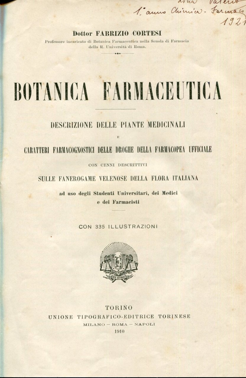 Botanica farmaceutica. Bescrizione delle piante medicinali e caratteri farmacognostici delle droghe della farmacopea ufficiale, con cenni descrittivi sulle fanerogame velenose della flora italiana : ad uso degli studenti universitari, dei medici e dei farmacisti. Con 335 illustrazioni.
