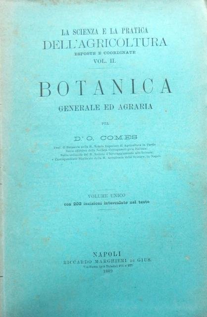 Riccardo Marghieri di Gius., Napoli, 1889. Appartenente alla collana “La scienza e la pratica dell'agricoltura esposte e coordinate”, vol. II. Volume unico. In 4to piccolo, pp. XVIII 857 (con Indici), 202 incisioni intercalate nel testo, bross. edit. in carta verdina. Il presente volume è unico e completo. Opera importante e principale del botanico campano (Monopoli, 1848 – Portici, 1917). Un generale ingiallimento dovuto al tipo di carta, e un distacco del corpo fra la pag. 334 e 335 e la 726 e la 727, dovuto al tipo di brossura a lievi fili di cucitura e alla sottile carta al dorso.