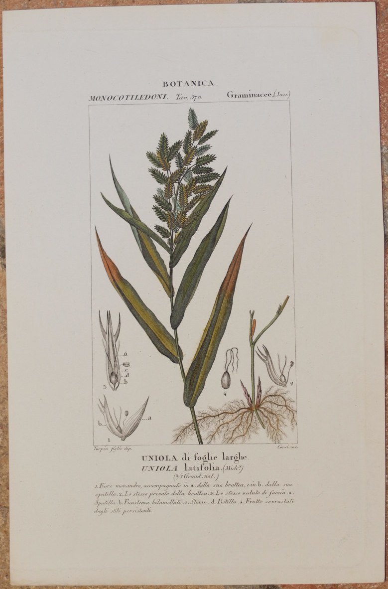 Eccellente incisione creata dal maestro Pierre Jean Francis Turpin. Le scritte indicanti la specie e la descrizione della pianta o animale sono in italiano e/o latino, e provengono dalla prima edizione italiana del Dizionario di scienze naturali edito da Battelli nel 1831. Quest'opera imponente era composta da 29 volumi ed era corredata da centinaia di incisioni che rappresentavano tutto il mondo animale e vegetale. L'opera deriva da un eccellente lavoro di luminari del XVIII secolo supportati dal Re francese Louis XV in seguito guidati dallo stesso Turpin, considerato al tempo il più grande incisore di botanica. La maggior parte delle incisioni sono firmate Turpin & Pretre. Le incisioni sono veramente eccezionali con una grande dovizia di particolari e dipinte a mano. Carta bianchissima e resistente di ottima qualità. Formato foglio: cm 25x16,5. Formato incisione: cm 15x9 Autore: Corsi su disegno di Turpin In buone condizioni. Superb engraving made by the master Pierre Jean Francis Turpin. The engravings are written in latin and italian and come from the first italian edition of Dictionary of natural sciences edited by Battelli in 1831. This imponent work was made up by 29 volumes and contained hundreds of engravings that represented all the plant and animal kingdom. This work derives from an excellent work of luminaries of the 18th century supported by the french King Louis XV and then directed by the same Turpin that was considered as the greatest botanical engraver of his time. The most of his engravings are signed Turpin & Pretre. The engravings are made in an excellent way with fine details and coloured by hand. Very white strong paper of good quality. In good condition. Page size: cm 25x16,5. Print size: cm 15x9 Author: Corsi upon drawing of Turpin In good conditions. <BR>