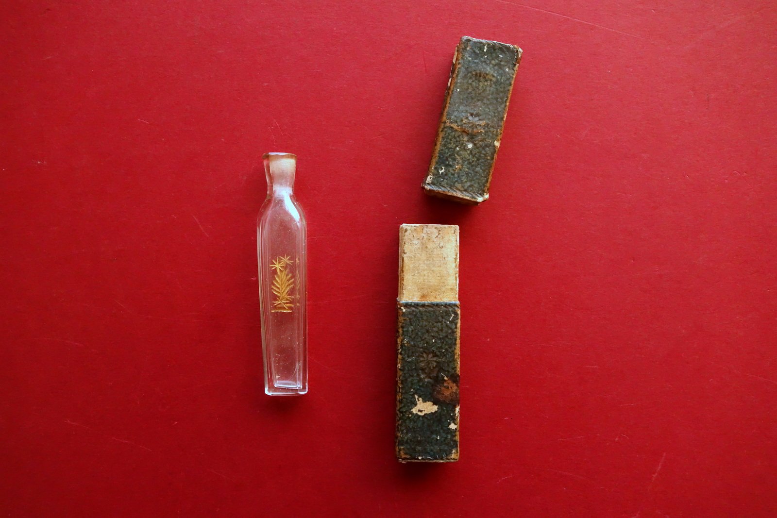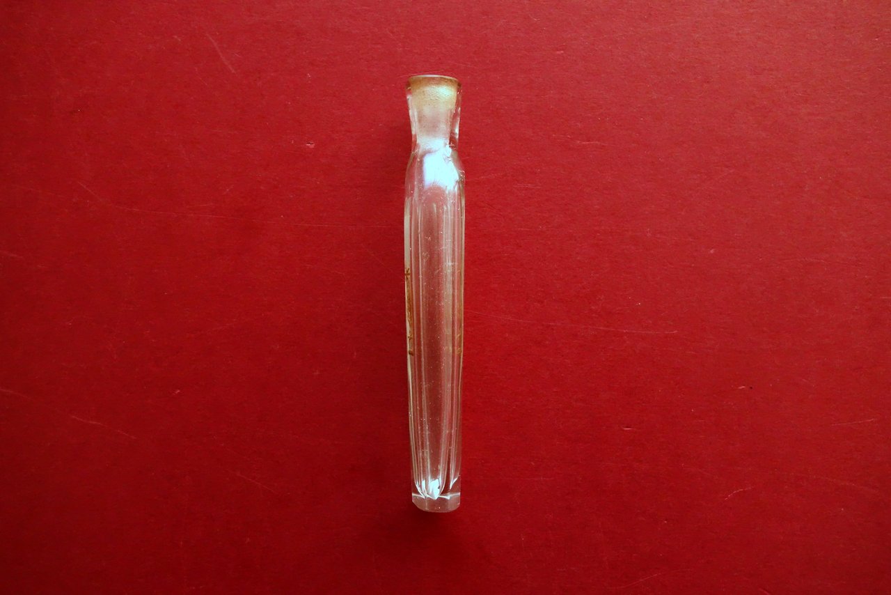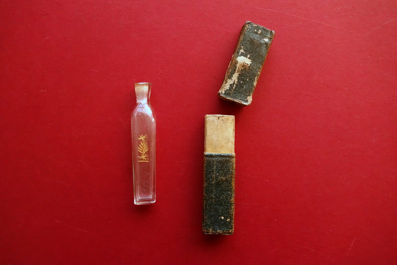 Antica bottiglietta per profumo, Antica bottiglietta per profumo con stemma impresso in oro corredata di custodia d'epoca in cartonato rivestito con bella carta varese, recante a secco un piccolo fregio floreale fine '700 - primo '800 circa S. d. ma fine '700 - primo '800 circa; antica bottiglietta per profumo, che reca a entrambi i lati stemma impresso in oro. La bottiglietta è corredata di custodia in cartonato rivestito con bella carta varese, recante a secco un piccolo fregio floreale (vedi foto). Dimensioni bottiglietta: altezza cm 8, larghezza cm 1,5, profondità cm 1. Condizioni di conservazione Esemplare in buone condizioni con tracce d'uso e del tempo; bottiglietta con lievi fisiologiche tracce di sporco, probabilmente mancante del piccolo tappo in vetro. Custodia in carta varese con alcune piccole / minime leggere abrasioni e pochi aloni. Raro oggetto originale, di ottima fattura. Bottiglietta probabilmente mancante del tappo in vetro. SC04.D0457 N